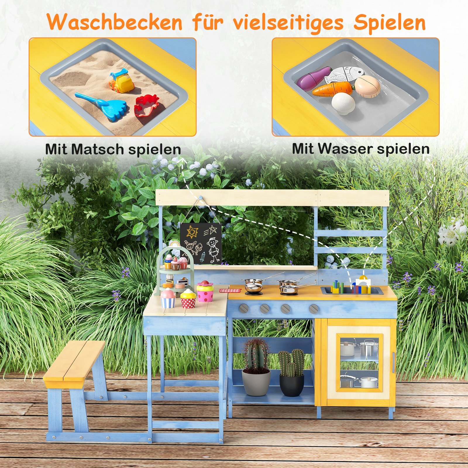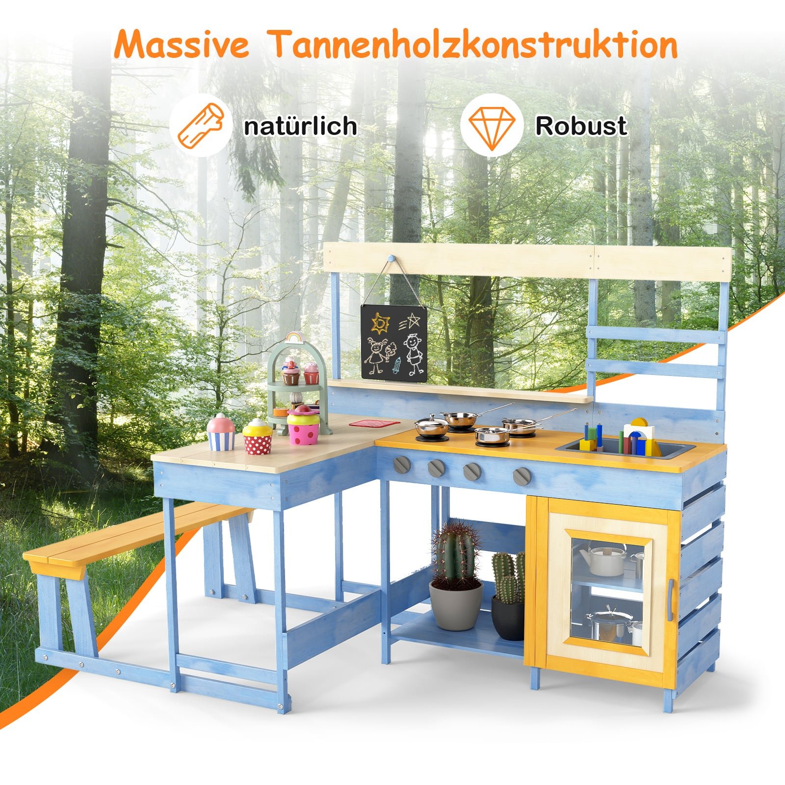 Eglės medienos lauko virtuvėlė su pikniko stalu ir suoliuku vaikams (Mėlyna)