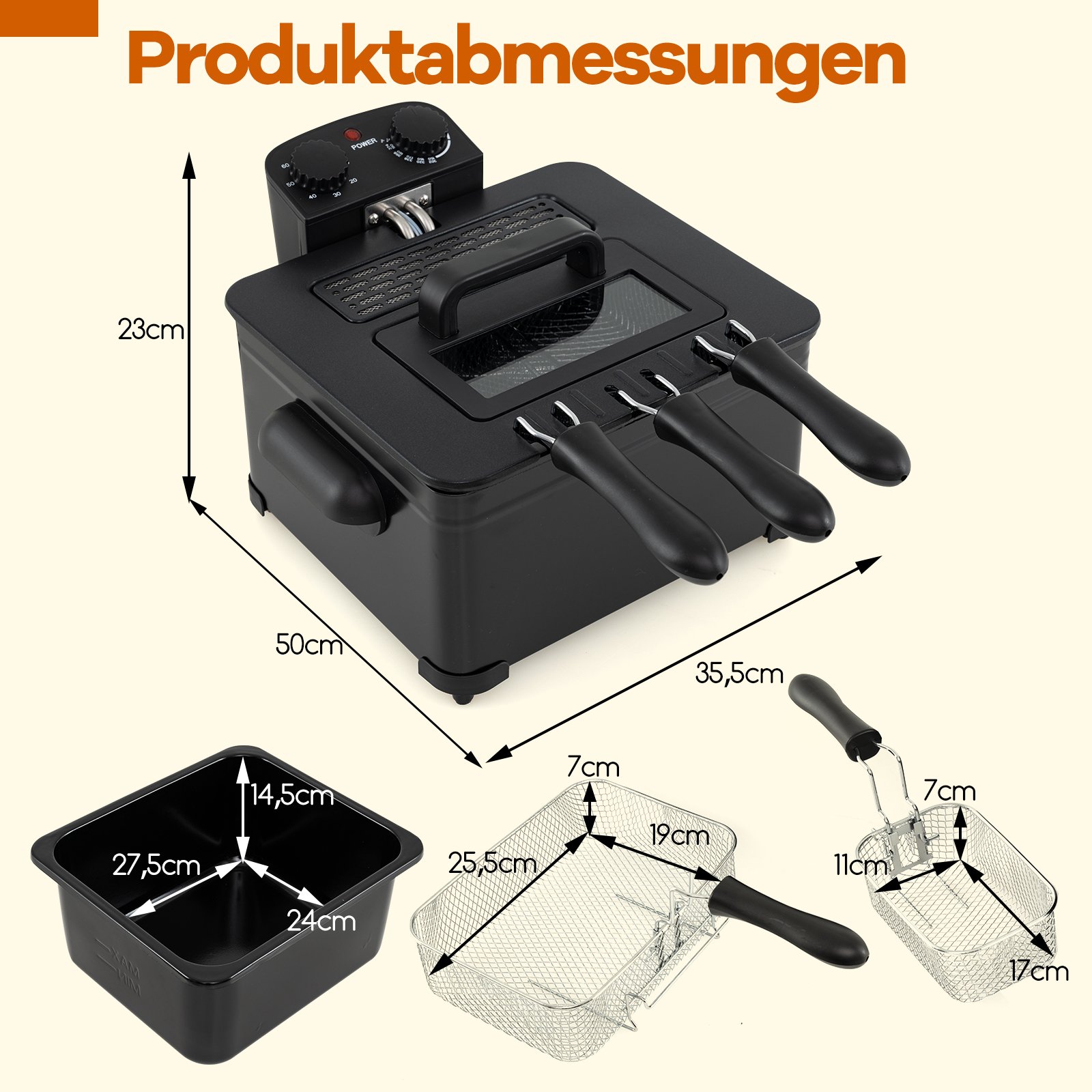 - Didelė 5 litrų aliejaus talpa ir trys kepimo krepšeliai efektyviam kelių patiekalų ruošimui vienu metu.