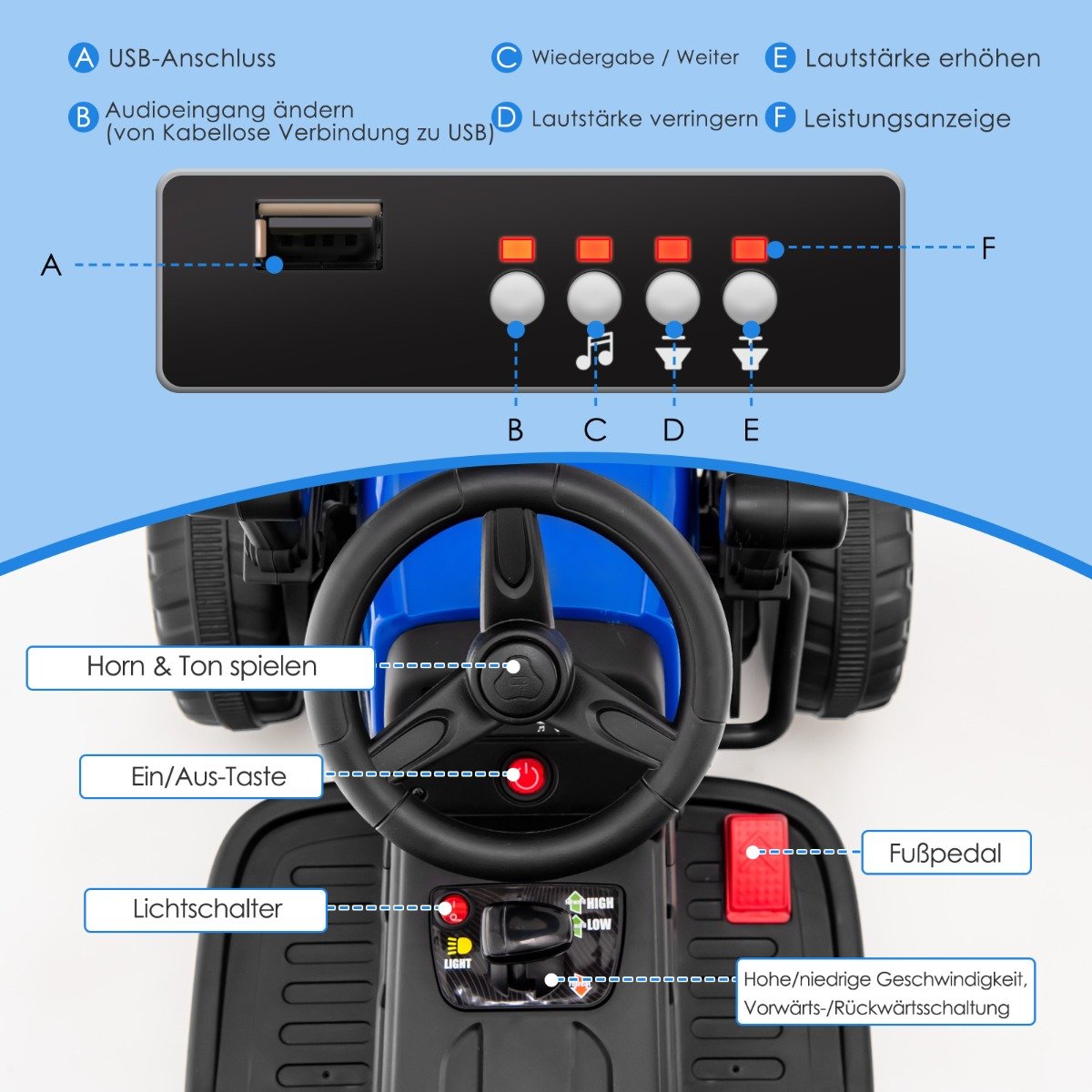 Elektrinė vaikiška kelio volelio transporto priemonė su muzika ir šviesomis (Mėlyna)
