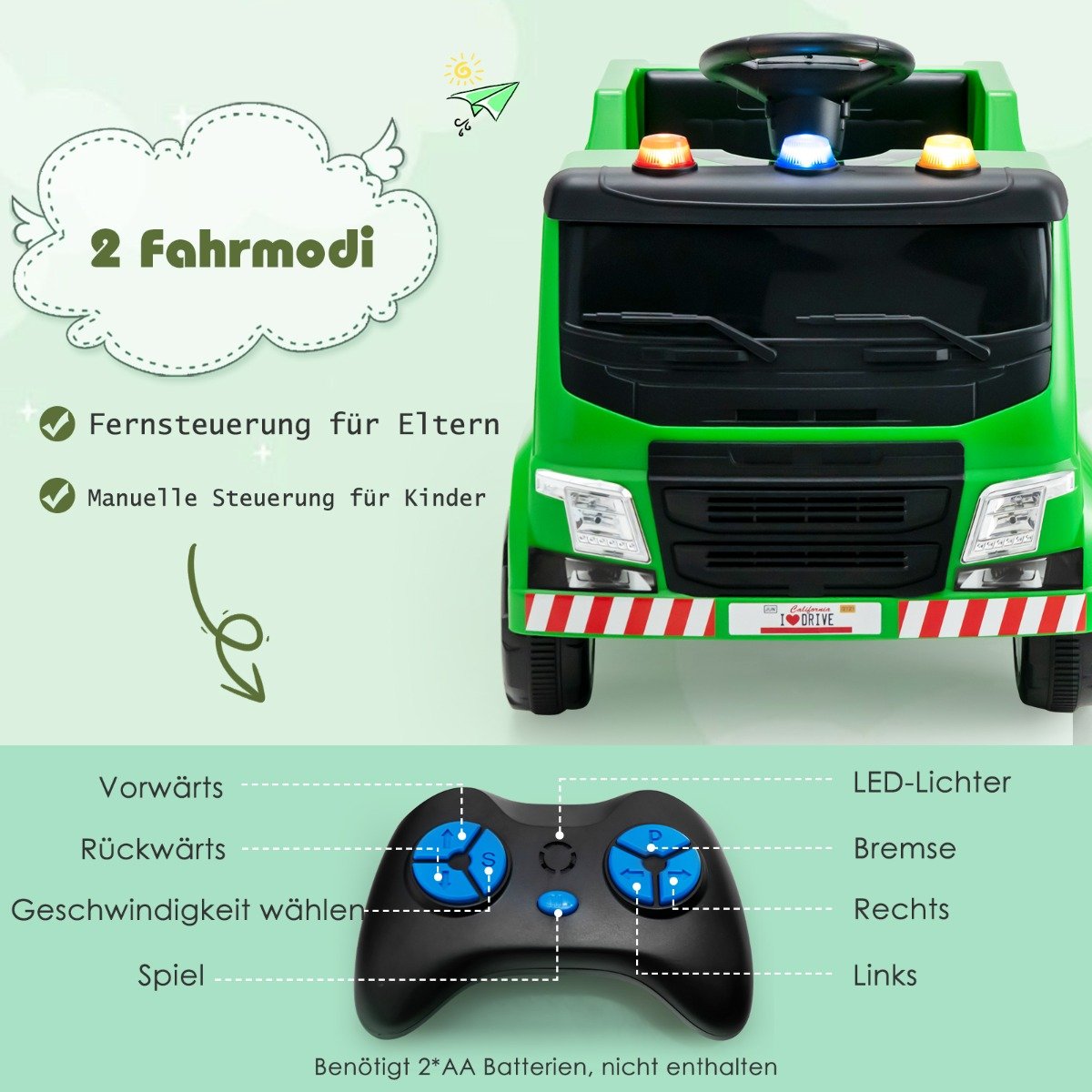 • Du vairavimo režimai: vaikas gali vairuoti savarankiškai arba tėvai gali valdyti nuotoliniu pulteliu.