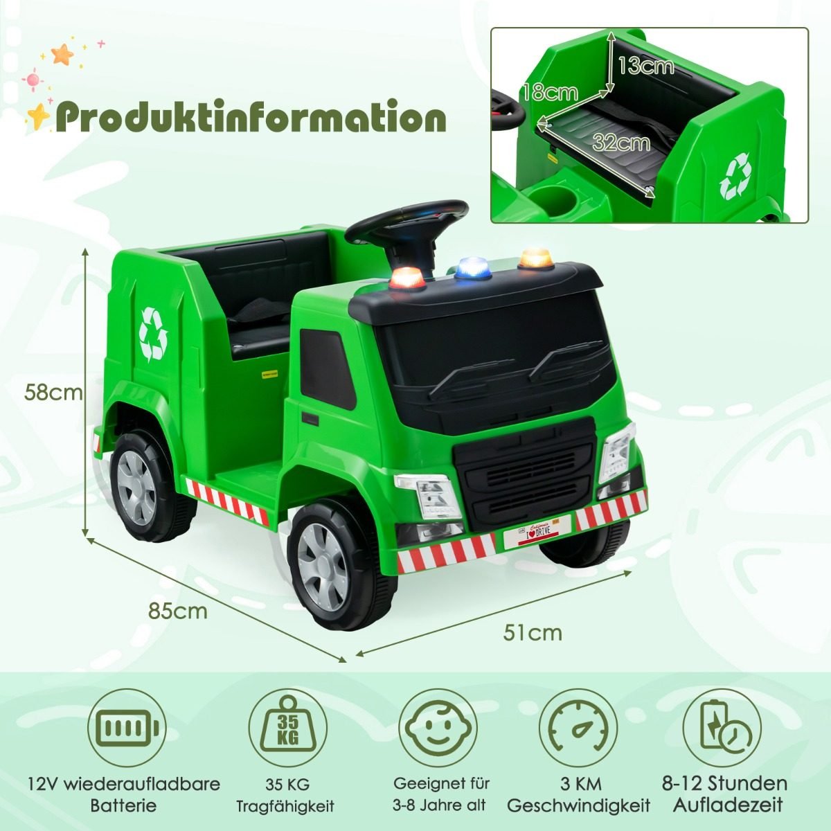 Dovanokite vaikams linksmą ir edukacinę patirtį su šia interaktyvia elektrine šiukšliaveže! Šis žaislas ne tik suteikia realistišką vairavimo potyrį, bet ir moko vaikus apie perdirbimo svarbą bei skirtingas atliekų rūšis.