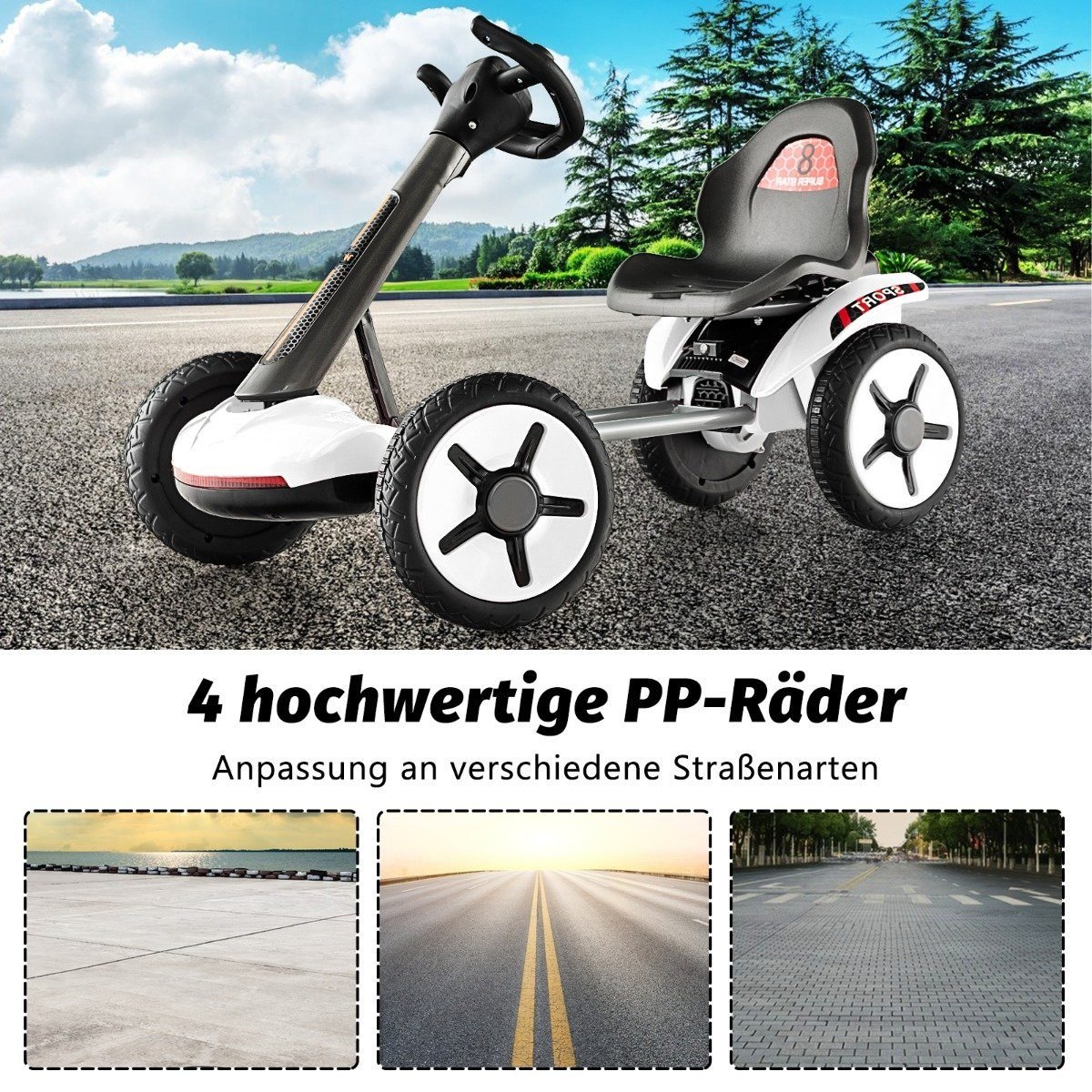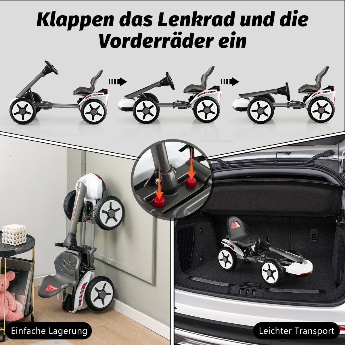 Mūsų elektrinis kartingas suteiks Jūsų mažajam lenktynininkui nepamirštamą, smagią ir jaudinančią patirtį. Reguliuojamas vairas ir sėdynė leis vaikams rasti pačią patogiausią važiavimo padėtį. Minkštas startas ir saugi atlošo atrama užtikrina maksimalų vaikų saugumą. Sulankstoma konstrukcija leidžia jį lengvai transportuoti ir laikyti.