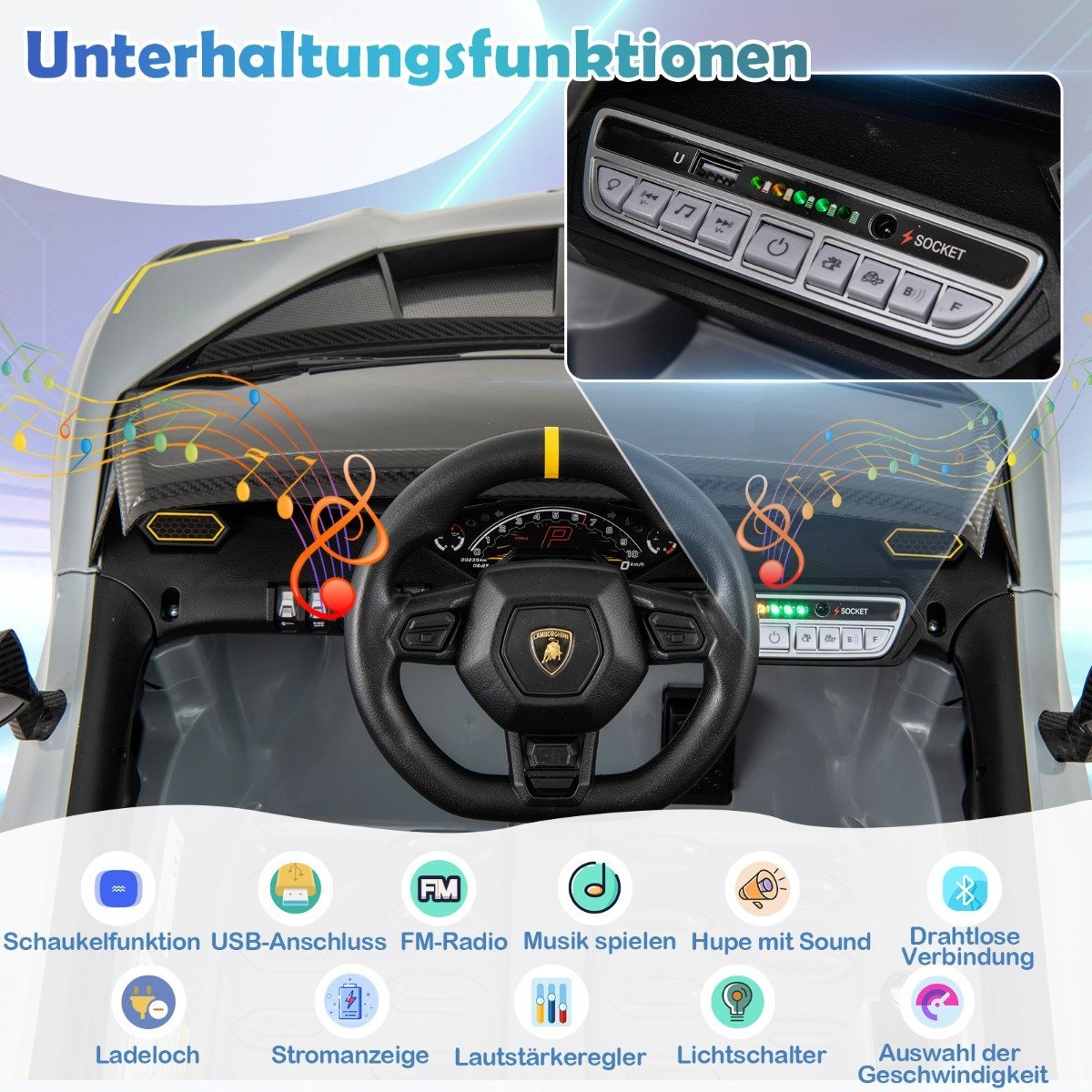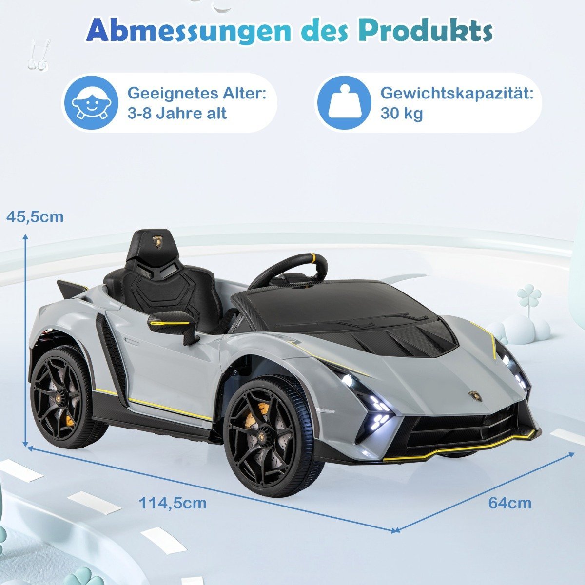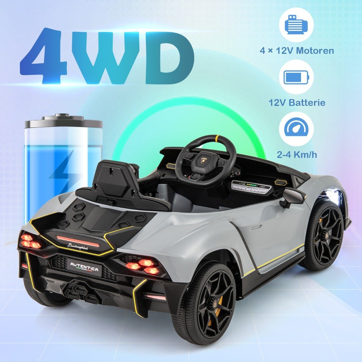 - Licencijuotas Lamborghini dizainas su autentiškais elementais.
