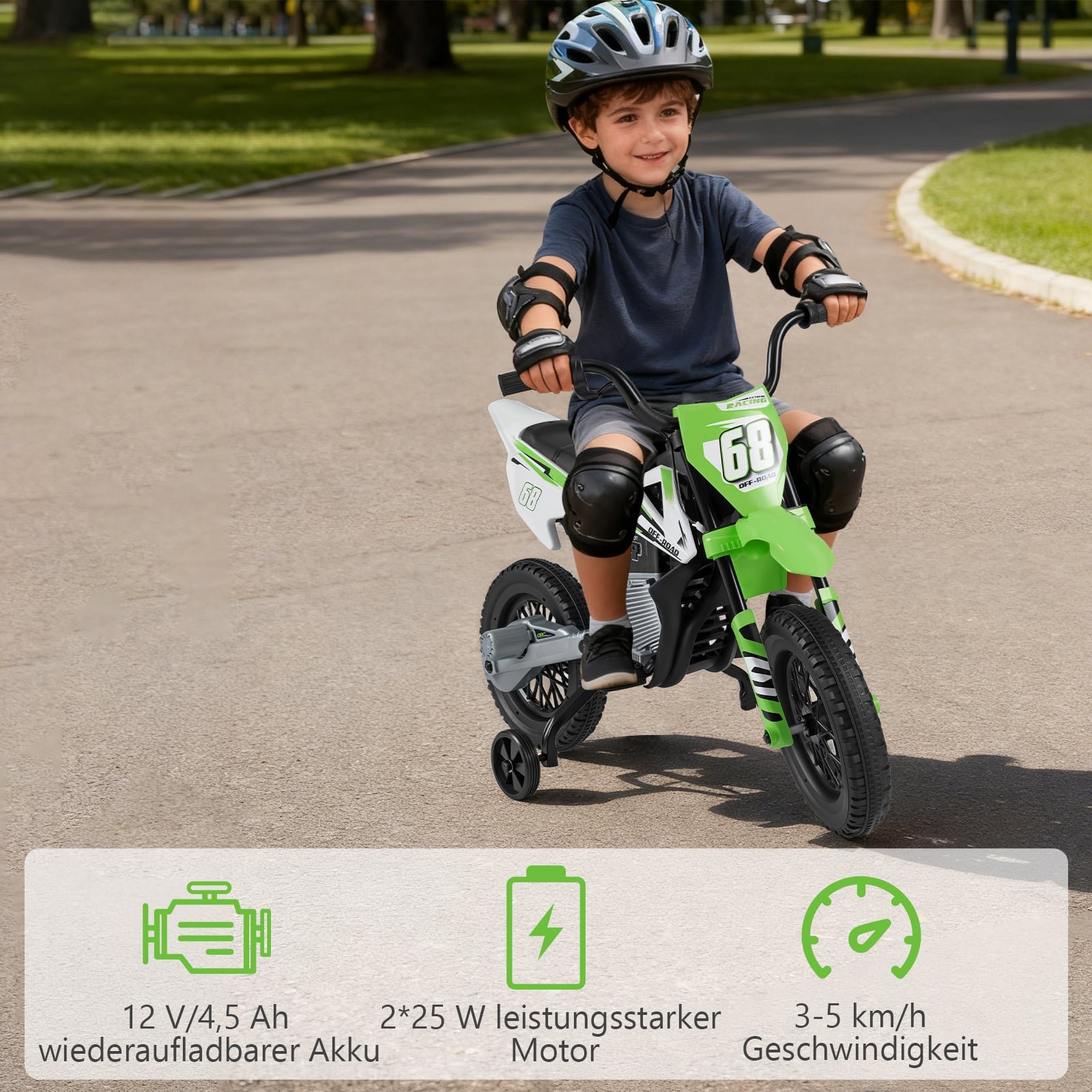Elektrinis motociklas vaikams su nuimamais pagalbiniais ratukais ir amortizacija 12V (Žalia)