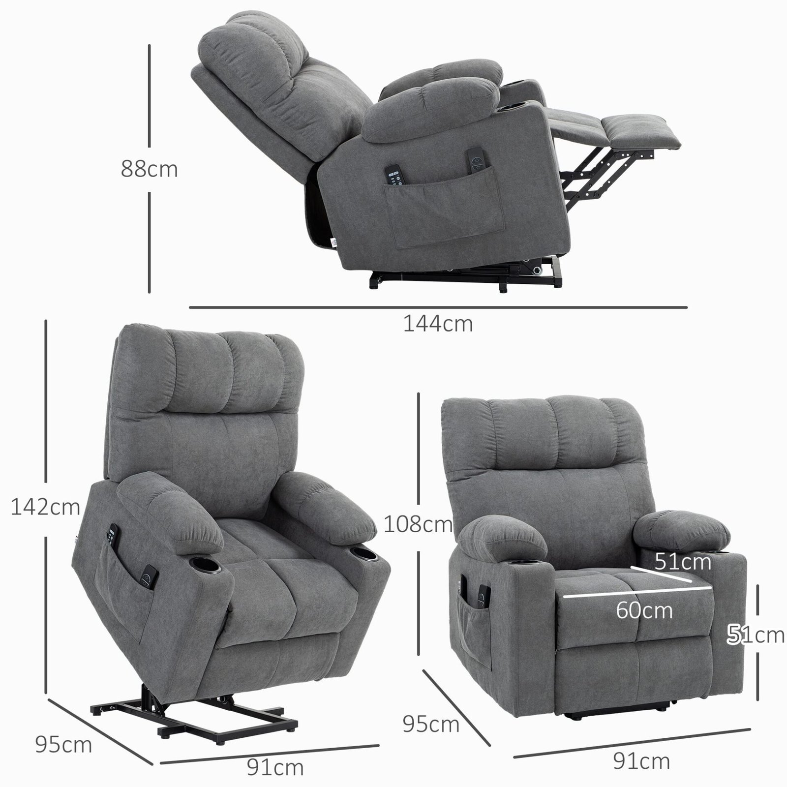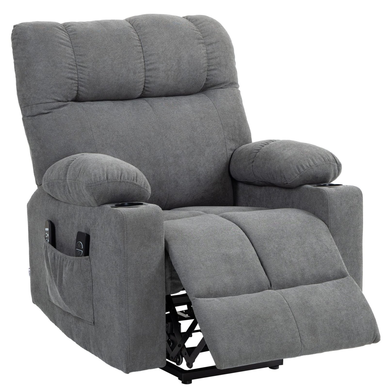 Atsipalaidavimo būdas pasikeis amžiams, dėka šio televizoriaus krėslo su pakėlimo funkcija. Padėkite kojas ant įmontuoto kojų atramos ir nustatykite atlošą į mėgstamą padėtį – atsiloškite, žiūrėkite televizorių ar nusnūskite. Ilsėsitės ant storai paminkštinto, minkšto audinio, o aštuoni poilsio krėslo masažo taškai padės sumažinti raumenų įtampą.