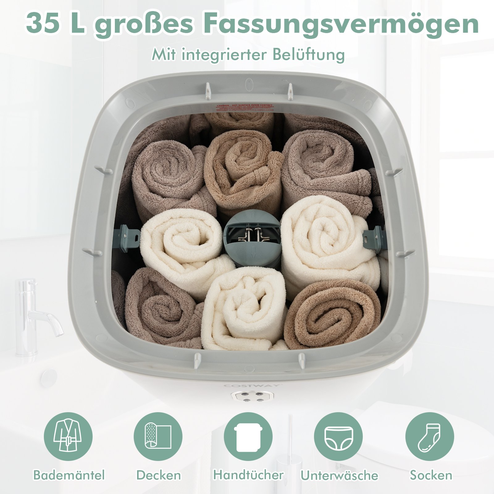 - Didelė 35 litrų talpa, puikiai tinkanti keliems rankšluosčiams ar pledams.