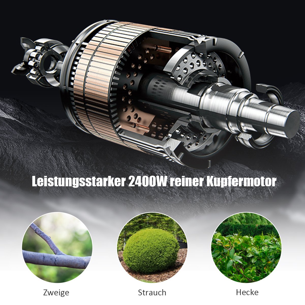 - Galingas 2400 W variklis su varine apvija ir aukštos kokybės plieniniu peiliu greitai bei efektyviai susmulkina iki 45 mm skersmens šakas.
