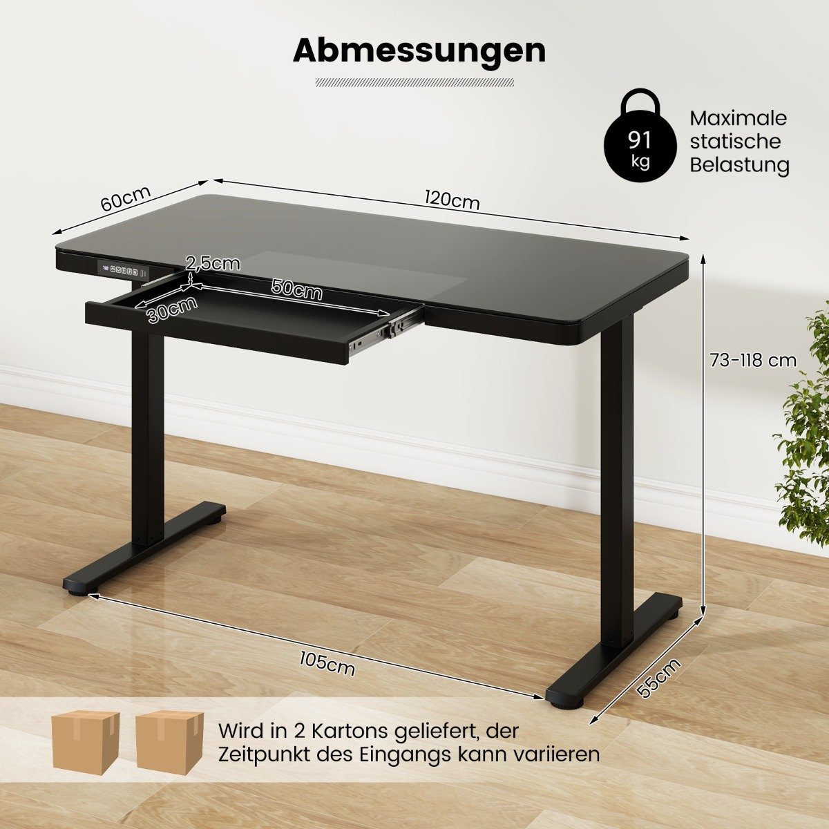 Pagerinkite savo darbo erdvę su šiuo moderniu elektriniu stalu, sukurtu maksimaliam patogumui ir stiliui. Jo elegantiškas, 120 cm ilgio grūdinto stiklo stalviršis yra atsparus vandeniui, įbrėžimams ir tinkamas rašyti, todėl puikiai tinka greitiems idėjų generavimo seansams.