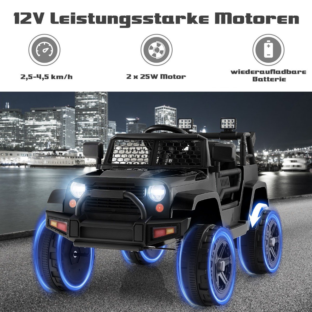 - Papildomos funkcijos: Priekiniai žibintai, muzika, garso signalas, MP3 grotuvas, USB jungtis