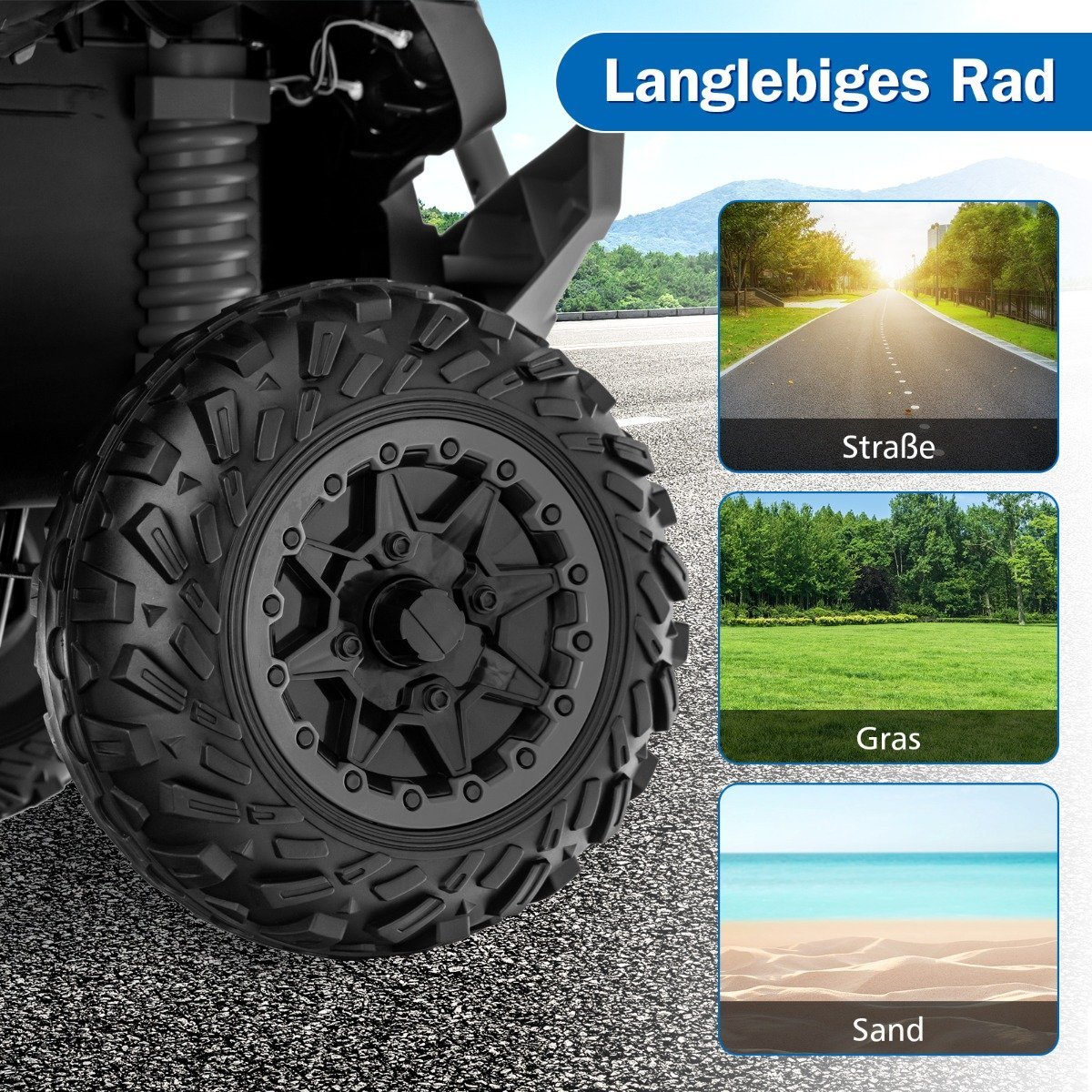 - Patvarūs ir stabilūs ratai: Keturi dideli (Ø 28 cm) ratai užtikrina sklandų važiavimą ant įvairių paviršių – asfalto, žolės ar smėlio ir pasižymi ilgaamžiškumu.