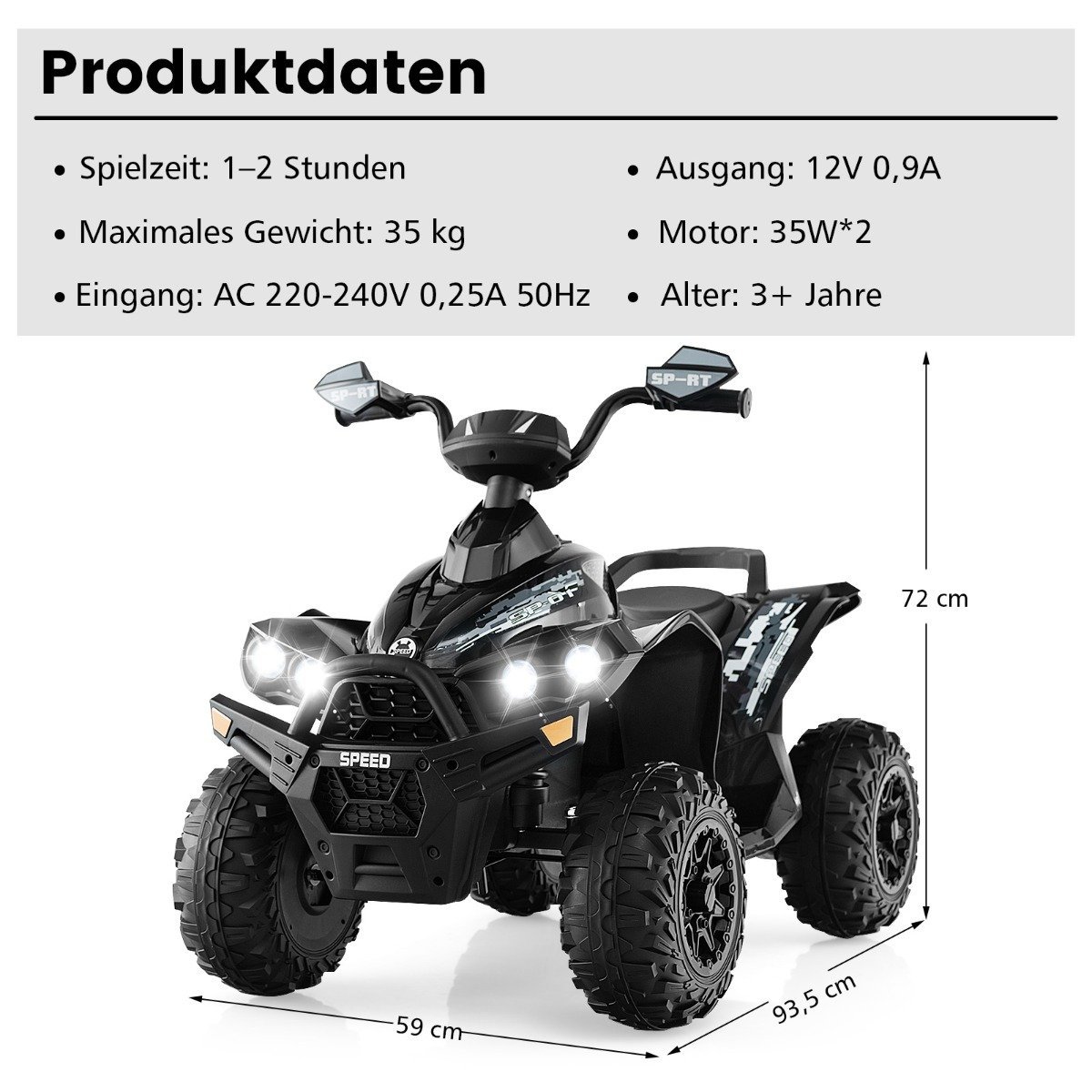 - Realistinė išvaizda: Su LED priekiniais ir galiniais žibintais, pedalais ir tikrovišku numerio ženklu, šis keturratis suteikia autentišką vairavimo patirtį.