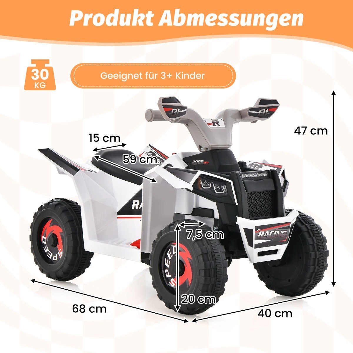 Elektrinis vaikiškas keturratis su pirmyn/atgal jungikliu ir 6V akumuliatoriumi (Balta)