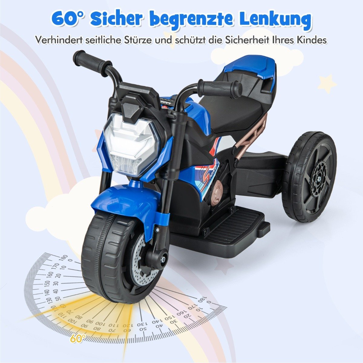 - Patogus ir ergonomiškas dizainas: plačios kojų atramos, patogi sėdynė ir specialiai vaikams pritaikytos rankenėlės užtikrina komfortą vairuojant.