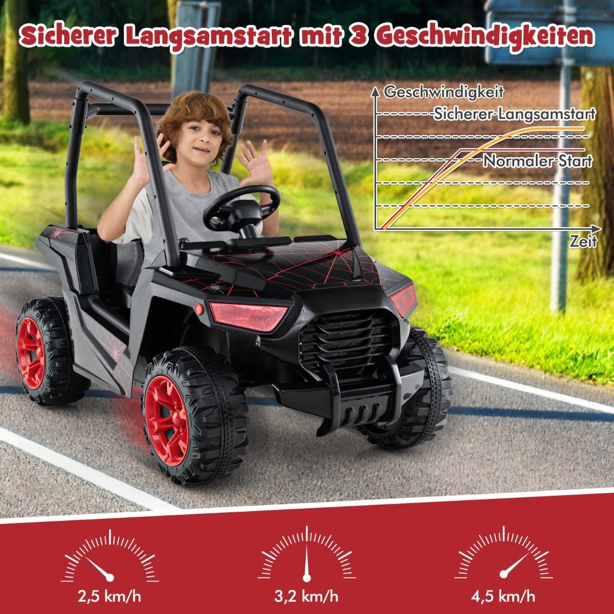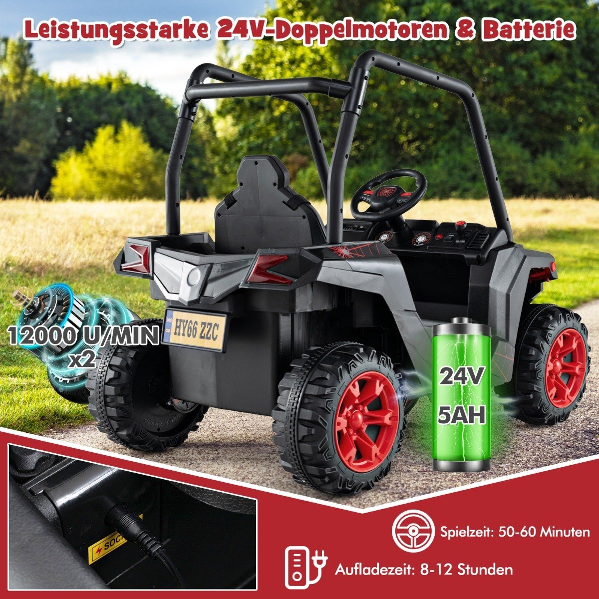 - Ilga žaidimo trukmė: galingas 24V akumuliatorius užtikrina 1-2 valandų veikimo laiką po pilno įkrovimo.