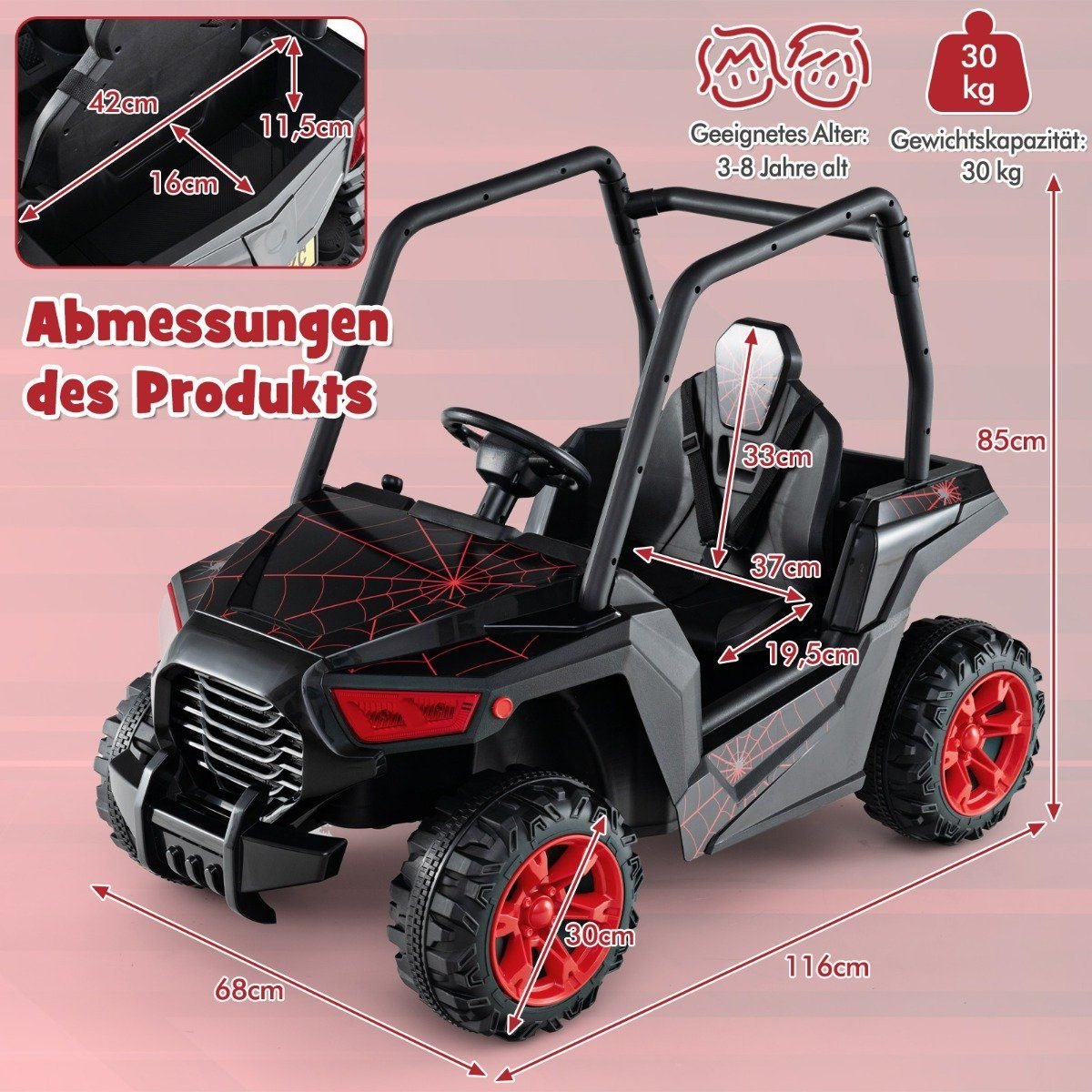 - Saugi konstrukcija: 3 taškų saugos diržas ir tvirtas rėmas apsaugo vaikus vairuojant.