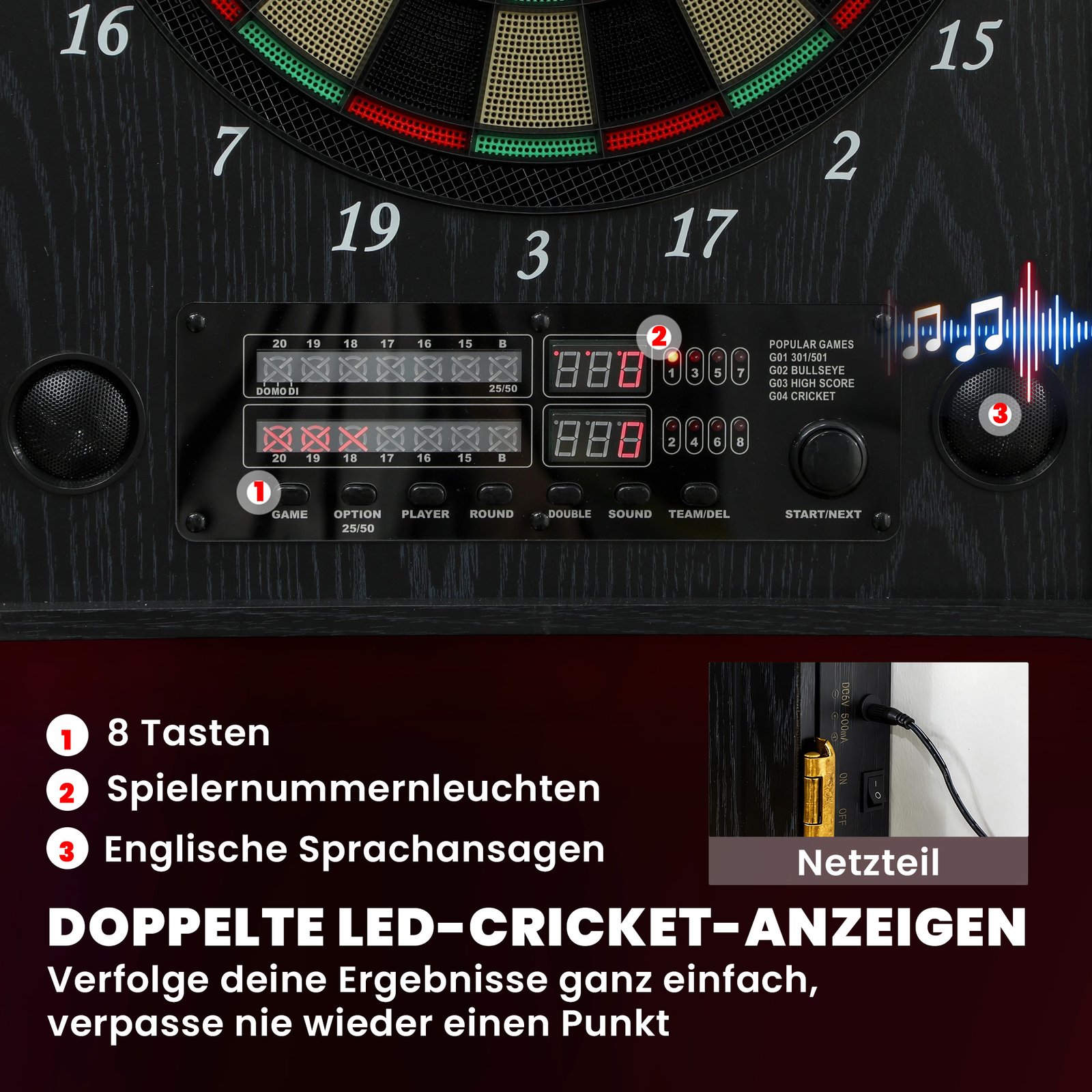 Elektroninės smiginio lentos gali gadinti nuotaiką dėl rankinio taškų skaičiavimo. Ši elektrinė smiginio lenta su spintele išsprendžia šią problemą: stilinga organizacija, 25 žaidimai, 202 variacijos iki aštuonių žaidėjų. Automatiniai LED ekranai pakeičia varginančią matematiką ir užtikrina atpalaiduojančią žaidimo patirtį.