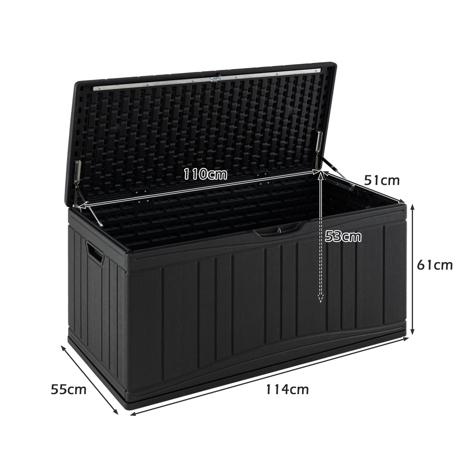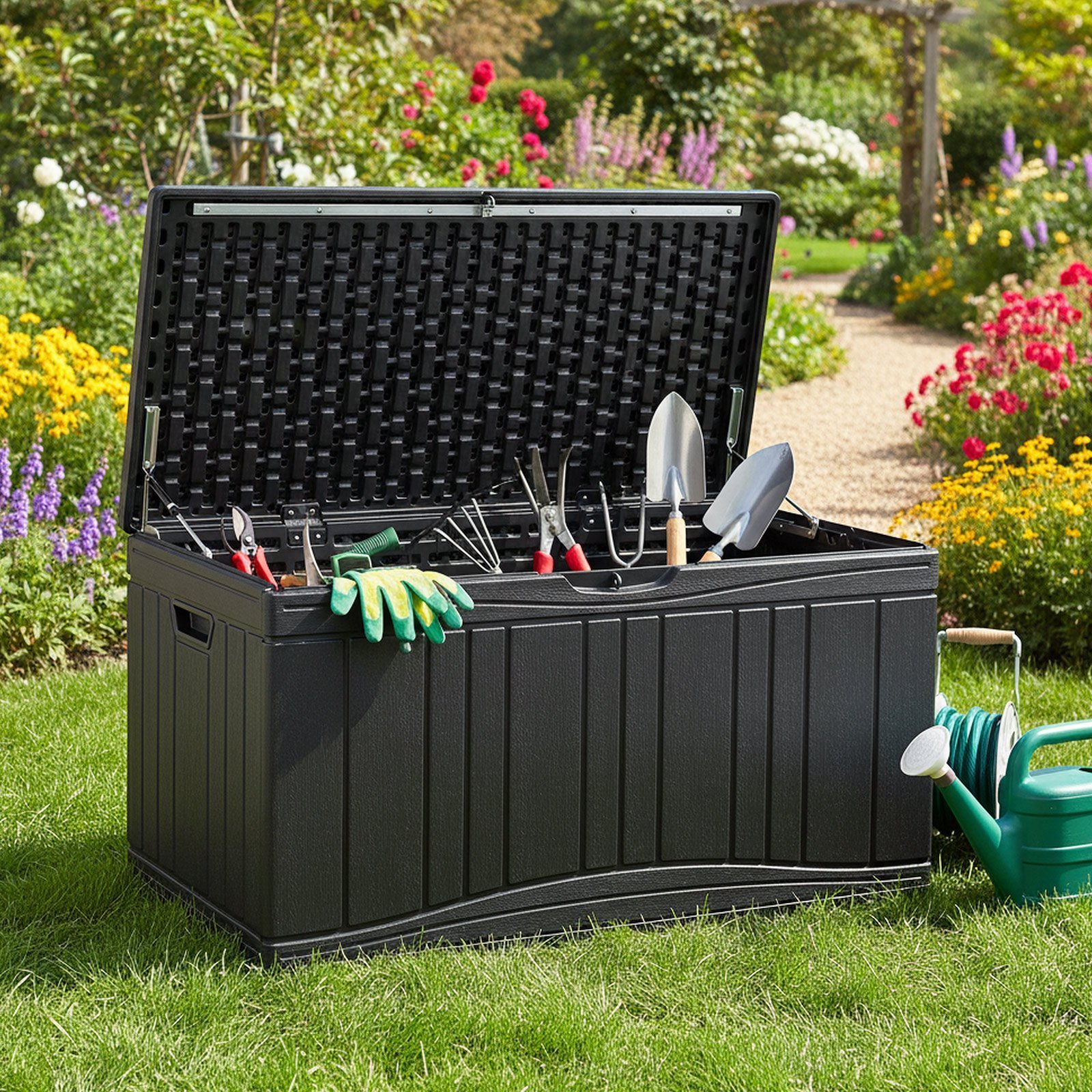 Išnaudokite savo lauko erdvę maksimaliai su šia erdvia 300 litrų talpos sodo daiktadėže. Ji puikiai tinka saugiai laikyti pagalvėles, įrankius, baseino priedus ir kitus daiktus. Pagaminta iš vandeniui ir UV spinduliams atsparaus HDPE plastiko, ši daiktadėžė atlaiko atšiaurias oro sąlygas ir yra lengvai valoma, užtikrindama ilgalaikį ir patikimą naudojimą.