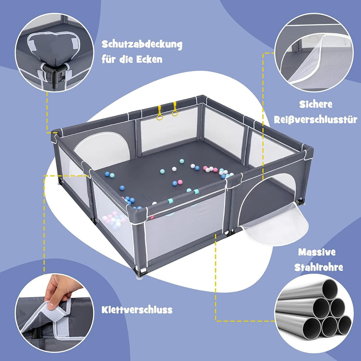 Mūsų aukštos kokybės maniežas su čiužiniu suteikia vaikams saugią erdvę žaisti ir tyrinėti. Dėl tvirtų siurbtukų jis itin stabilus ir nejuda, o per orui laidų tinklelį visada matysite savo mažylį. Erdvioje zonoje vaikai turės pakankamai vietos laisvai judėti, ropoti, sėdėti ir mokytis vaikščioti. Tai puiki pagalba tėvams, suteikianti jiems galimybę atsipalaiduoti.