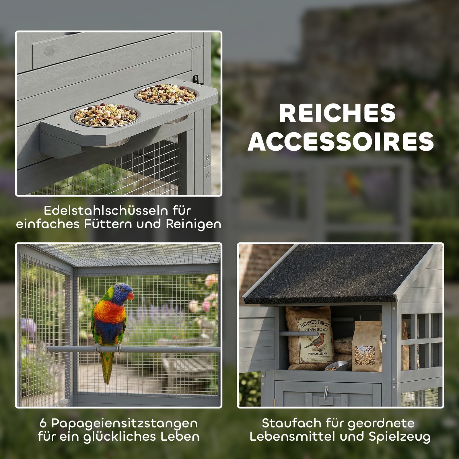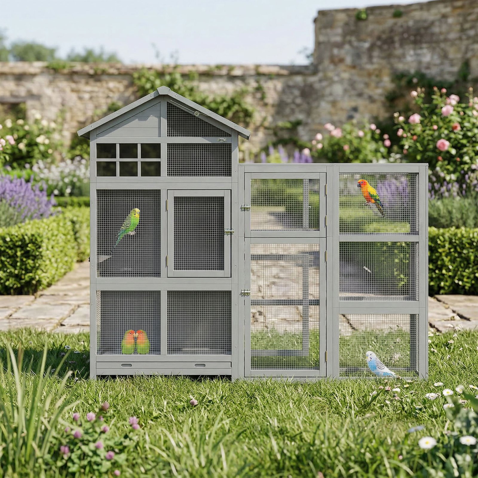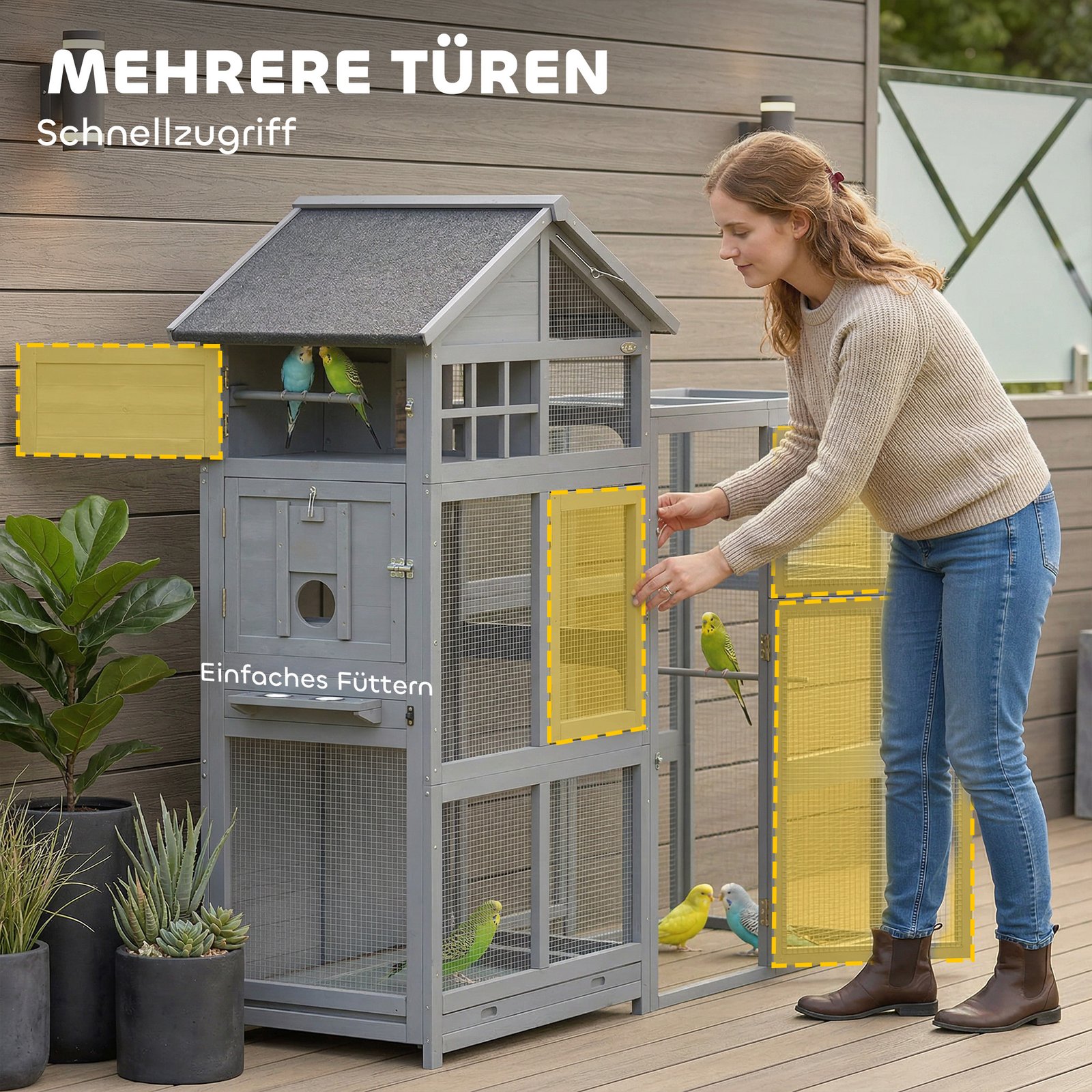 Erdvus medinis paukščių voljeras su ištraukiamu stalčiumi