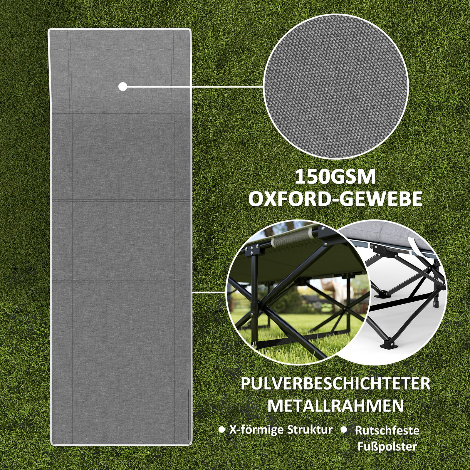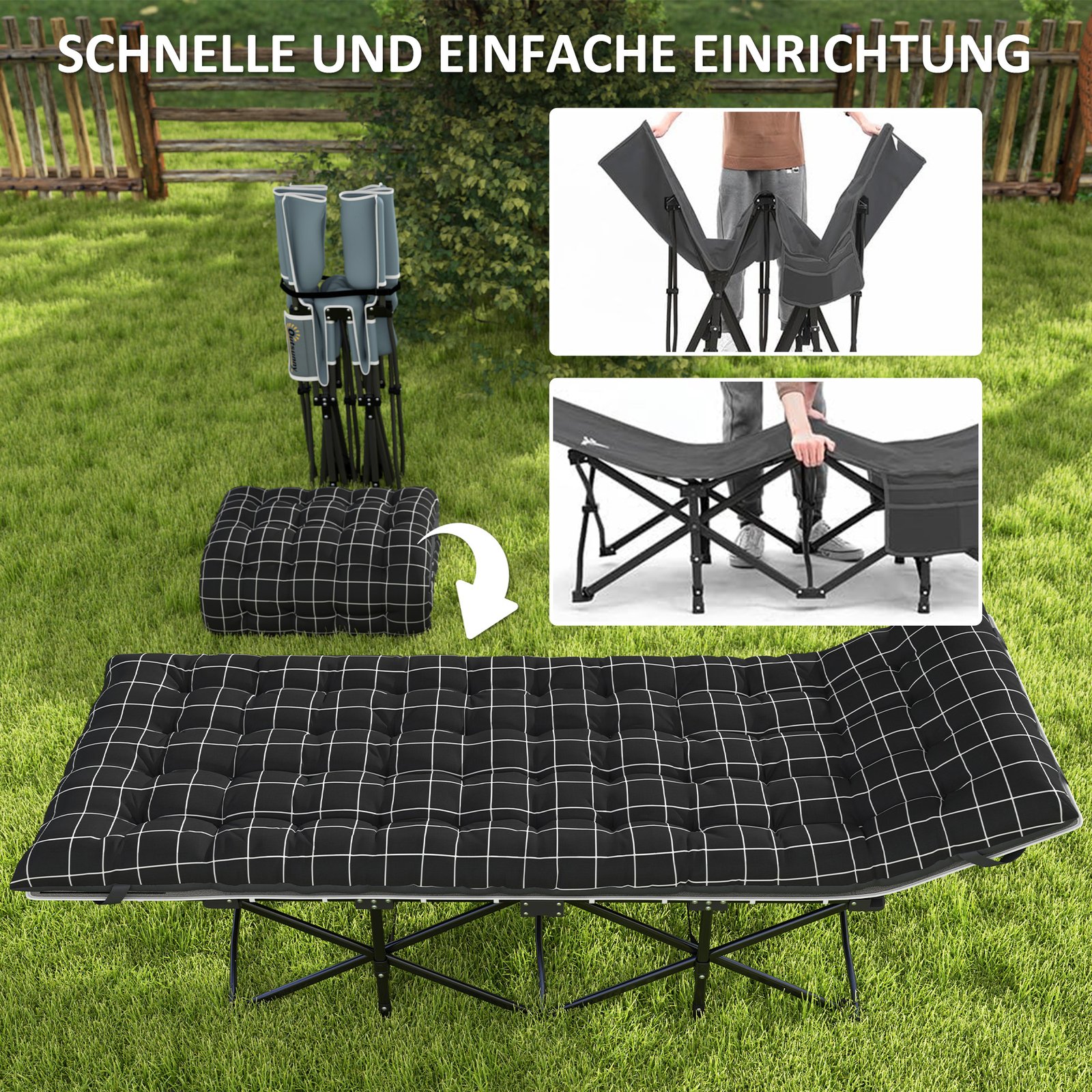 Patirkite komfortą su šiuo kempingo gultu: 9 cm storio čiužinys užtikrina jaukumą, kurį galima išimti šiltesniu oru. Sukurta su pakelta galvos atrama optimaliai kaklo atramai, ši mobili sulankstoma lova derina patogumą su komfortu – idealiai tinka nuotykiams lauke ar greitam poguliui.
