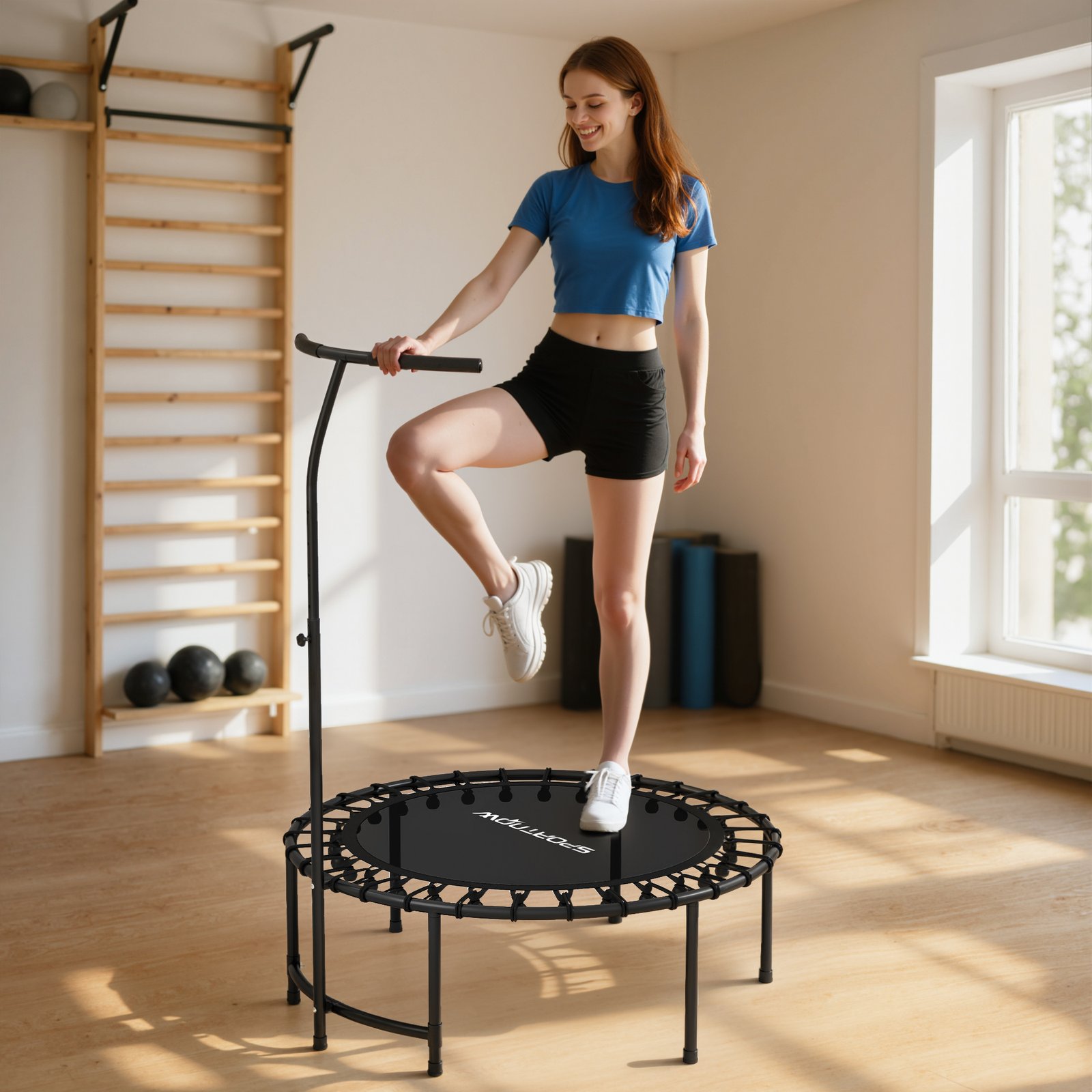 Pasinerkite į smagią ir sveiką treniruotę su šiuo fitneso batutu suaugusiems. Šis fitneso batutas, idealiai tinkantis viso kūno treniruotėms namuose, turi 36 elastines virves, užtikrinančias tylų ir sąnariams nekenksmingą šokinėjimą, bei stabilų plieninį rėmą, atlaikantį iki 100 kg. Reguliuojamo aukščio T formos batuto rankena užtikrina stabilumą kiekvieno šuolio metu, o neslystančios kojelės apsaugo jūsų grindis. Puikiai tinka kardio, pusiausvyros ir jėgos treniruotėms.