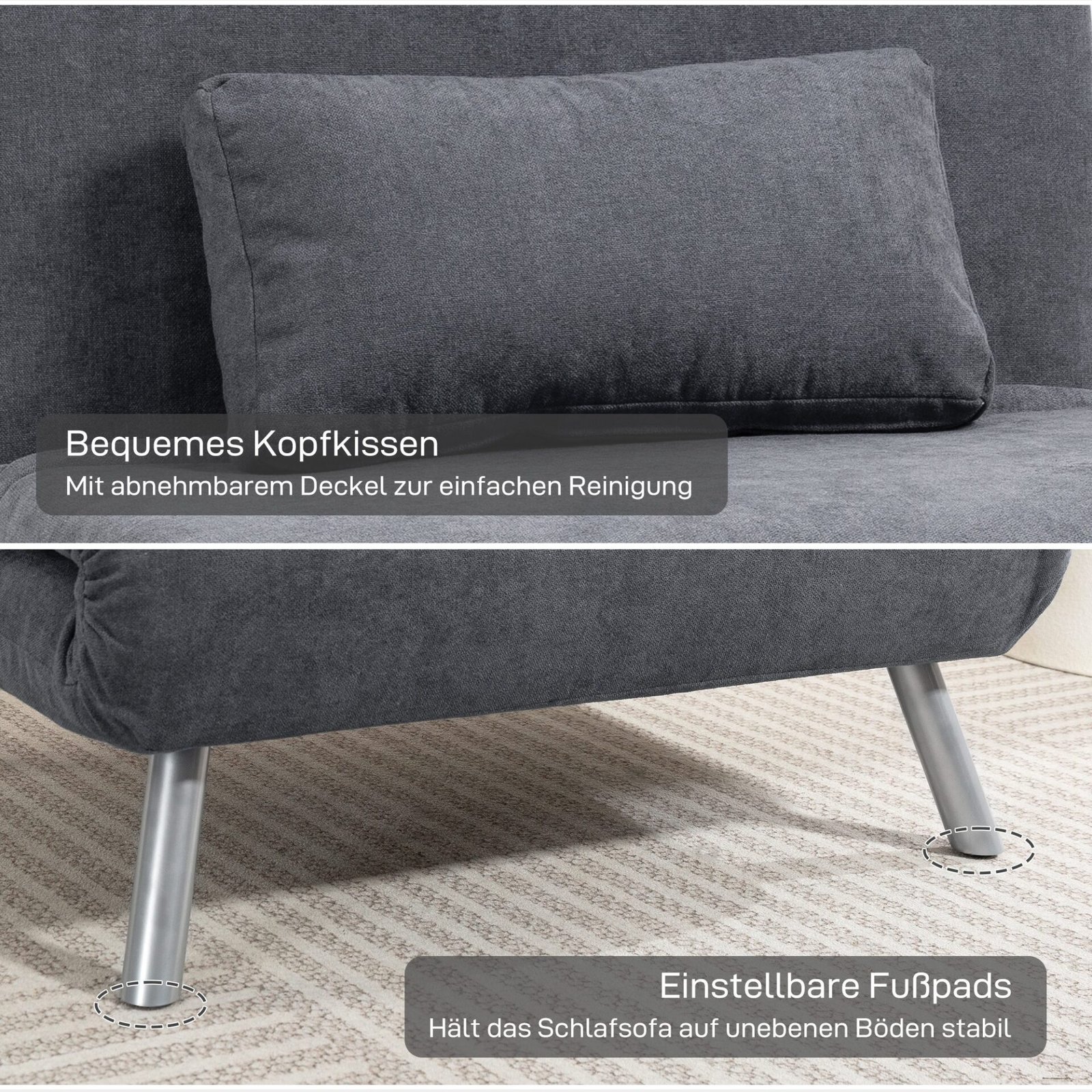 ✔ Tvirtas metalinis rėmas su neslystančiomis miegamojo fotelio kojomis užtikrina stabilumą.