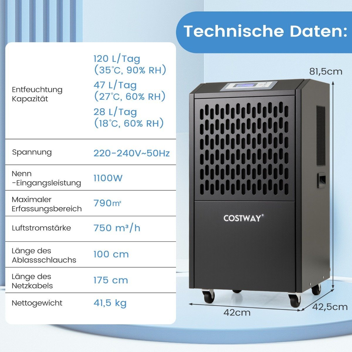 - Drėgmės šalinimo našumas: 118 l/parą (35 °C, 90 % RH); 47 l/parą (27 °C, 60 % RH); 28 l/parą (18 °C, 60 % RH)