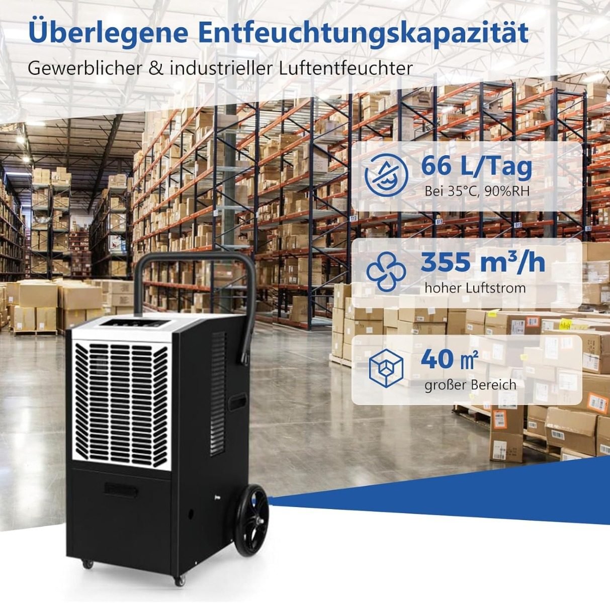 - Efektyvus drėgmės šalinimas dideliems plotams (iki 418 m²).