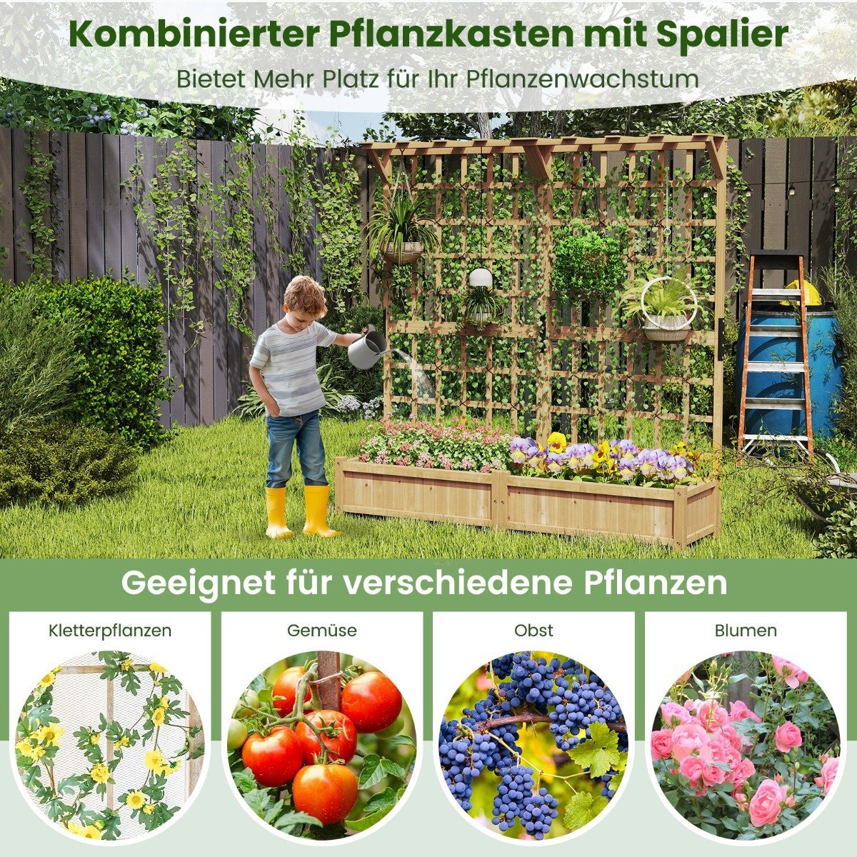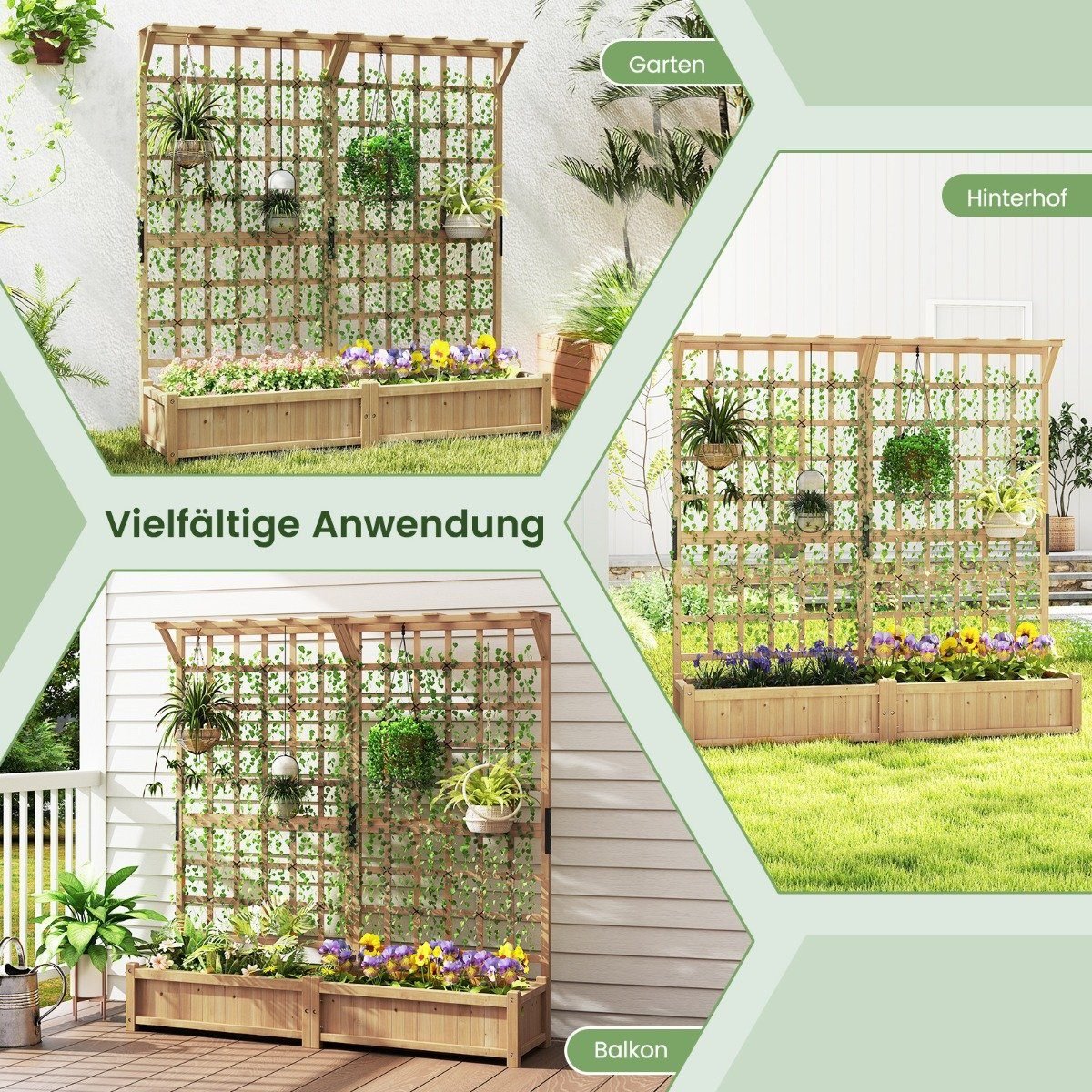 - 3-in-1 daugiafunkcis dizainas: 2 didelės gėlių dėžės, erdvus stogelis ir 2 atramos laipiojantiems augalams.
