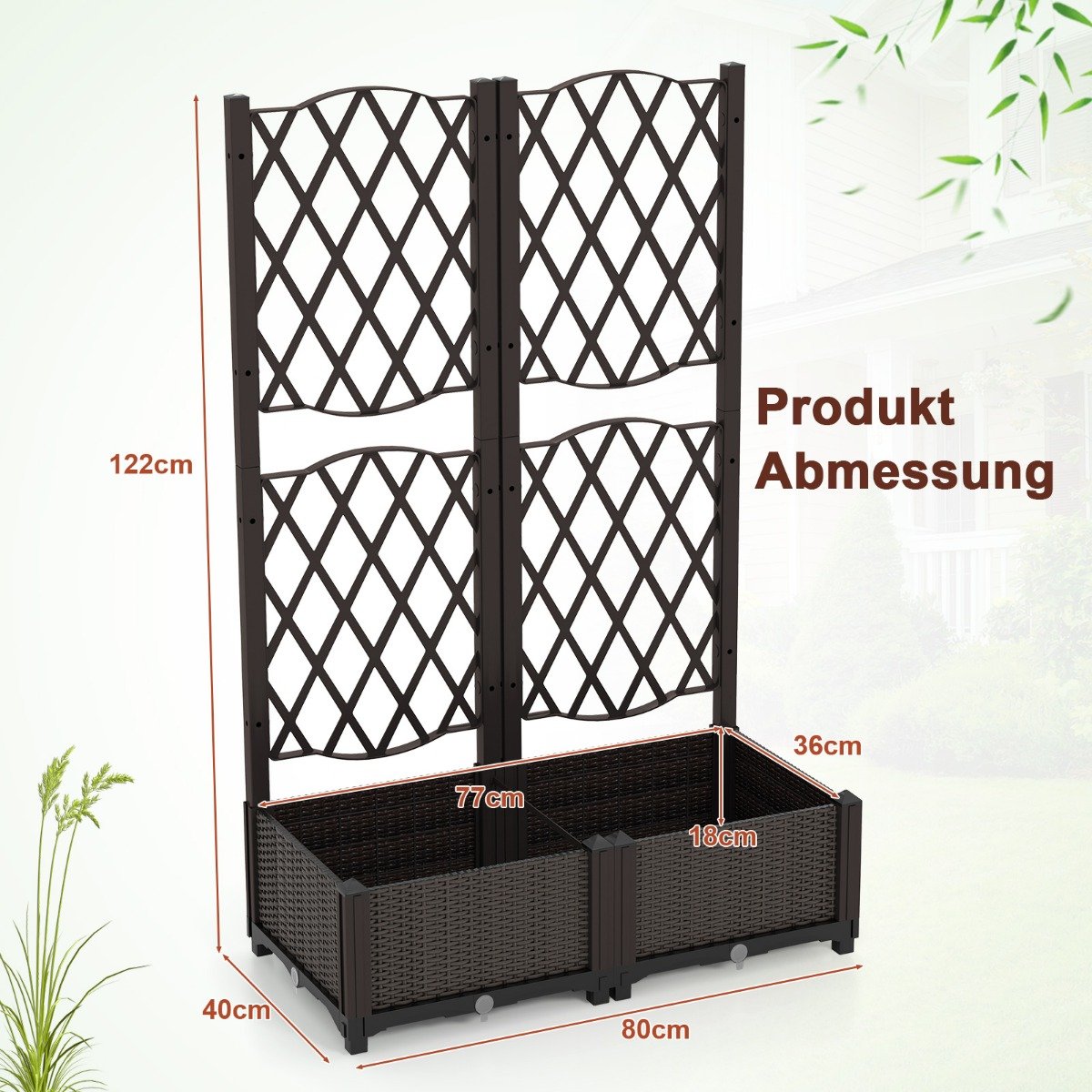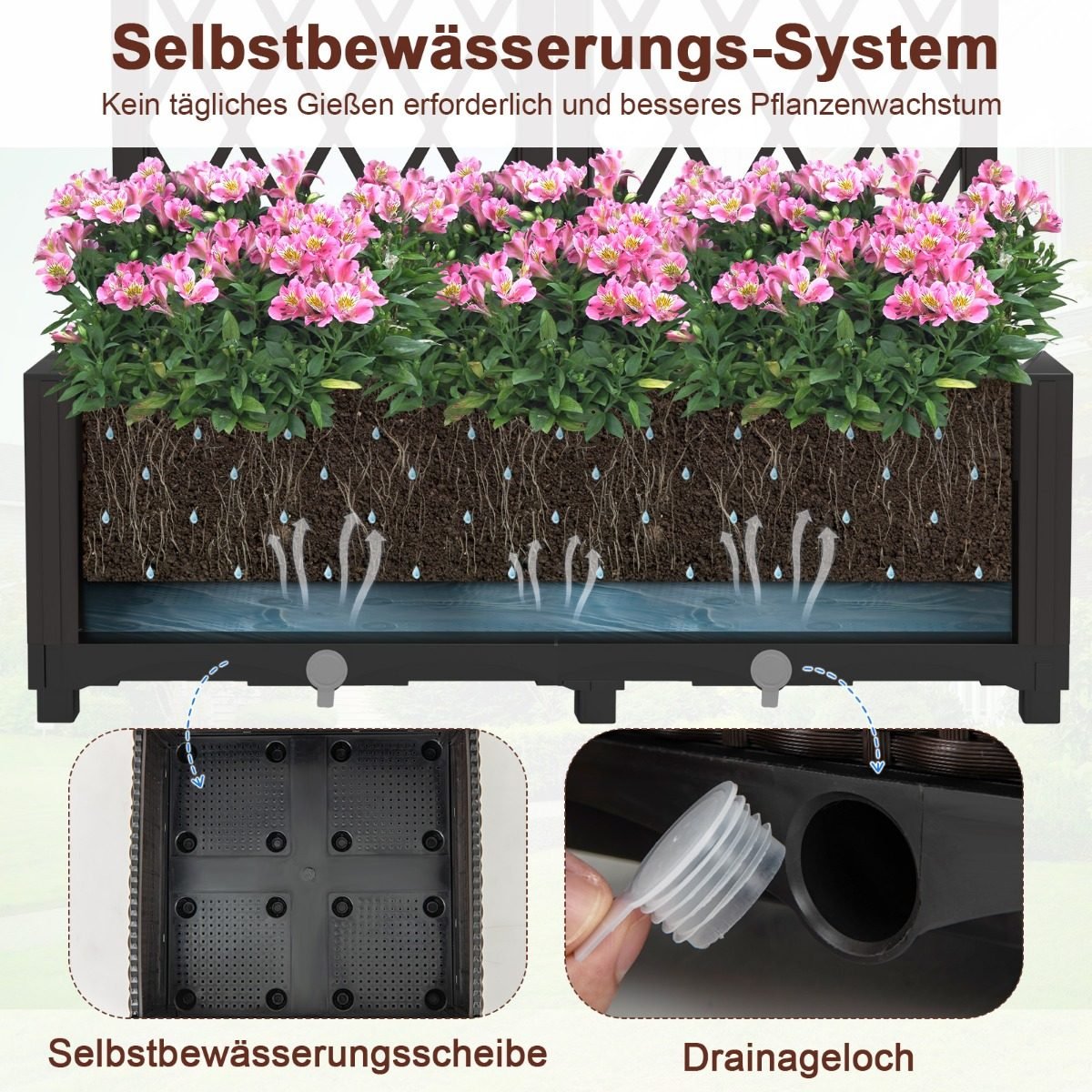 Papildykite savo sodą ar balkoną šia stilinga ir funkcionalia gėlių dėže su integruota atrama. Ji suteikia puikią erdvę daržovėms, gėlėms, prieskoniams ar vaisiams auginti, o vertikali atrama leis jūsų vijokliniams augalams klestėti ir tapti sodo puošmena.