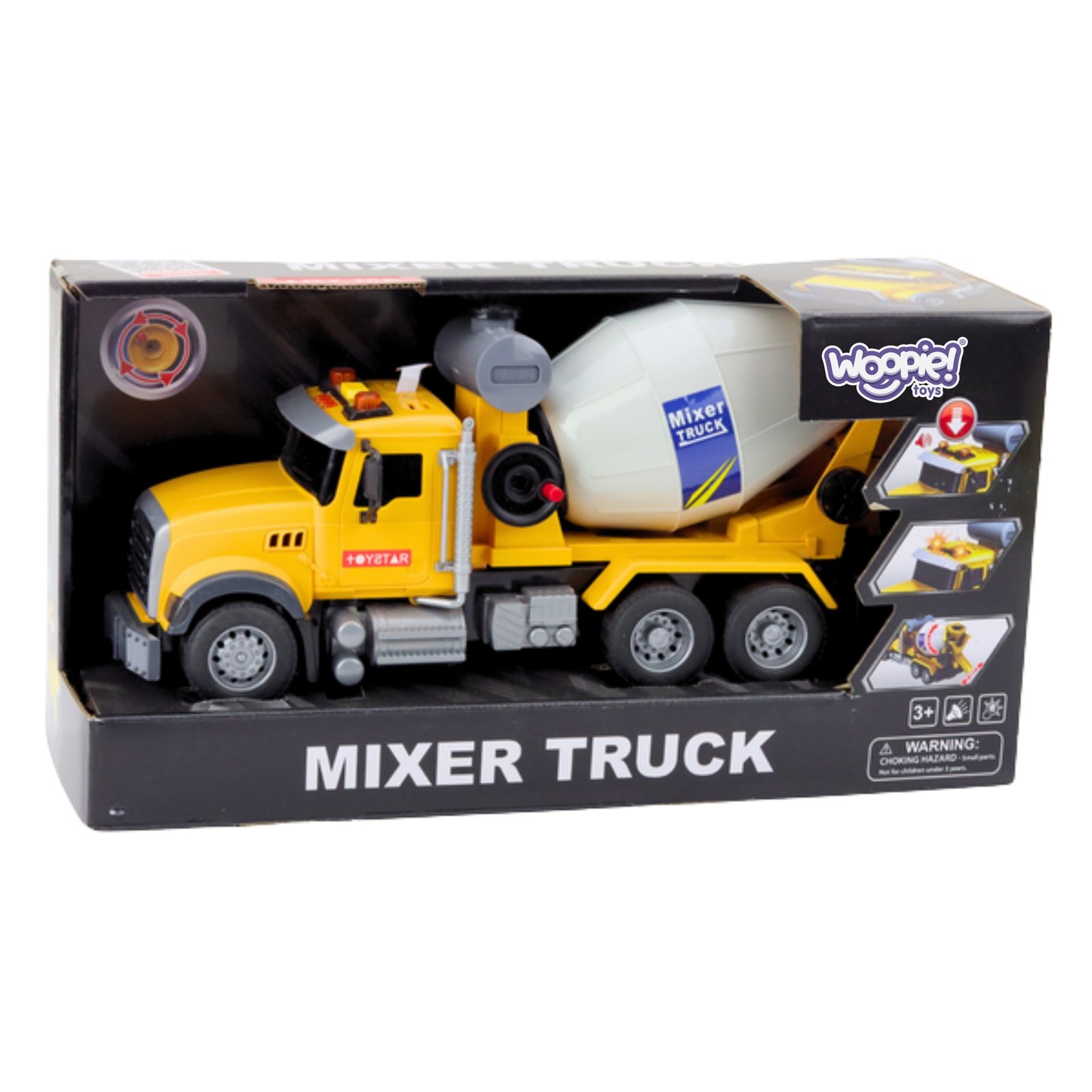 Šis tikroviškas „Woopie“ prekės ženklo betonvežis su besisukančiu būgnu, šviesomis ir garsais užtikrina įtraukiantį žaidimą, lavina vaizduotę ir rankų miklumą. Rankomis sukamas maišymo būgnas veikia kaip tikrame betonvežyje, o šviesos ir garso efektai, tokie kaip įspėjamieji signalai, garso signalas ar variklio garsas, suteikia dar daugiau tikroviškumo. Ryški geltona spalva patraukia vaiko dėmesį, o patvarus plastikas garantuoja saugumą ir ilgaamžiškumą. Žaislas komplektuojamas su baterijomis, todėl yra iškart paruoštas naudoti statybų aikštelėje!