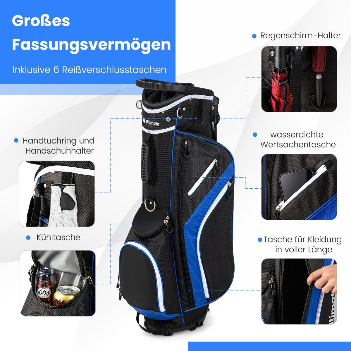 Golfo krepšys su 14 skyrelių ir 6 kišenėmis (Mėlyna)