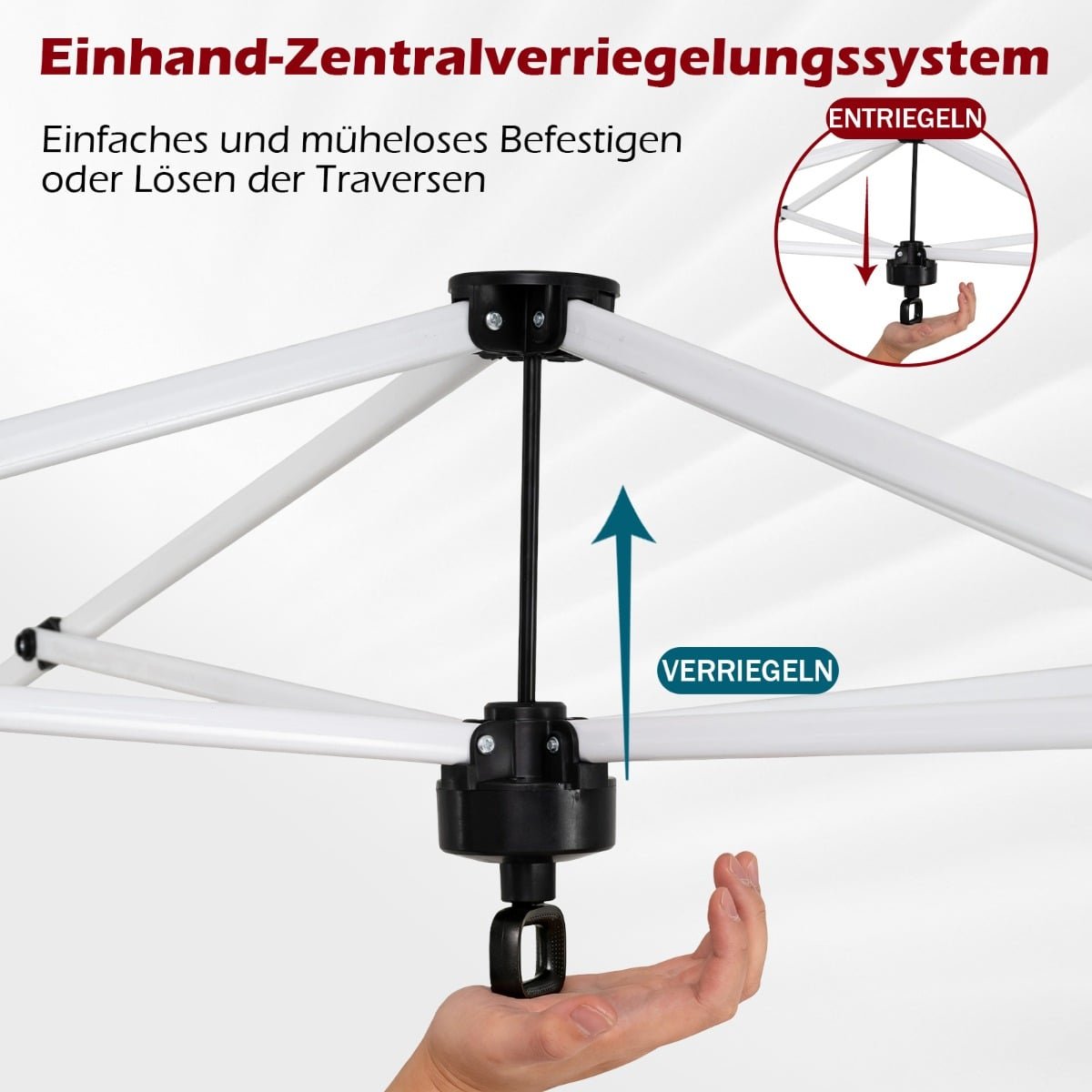 • Lengvas ir greitas montavimas: Dėl unikalaus vienos rankos centrinio užrakto mechanizmo pavėsinę lengvai ir greitai pastatysite net vienas.