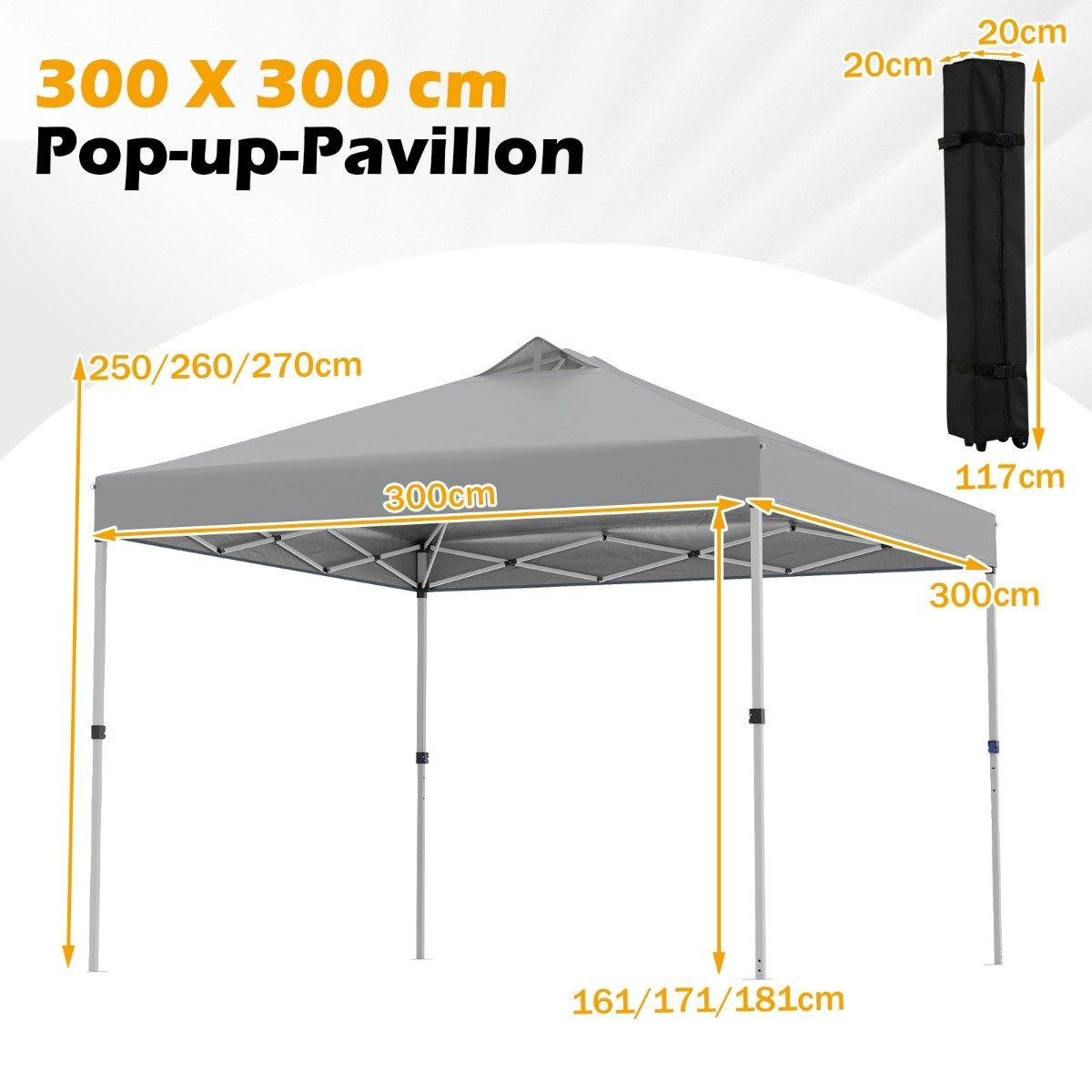 - Produkto matmenys (I x P x A): 300 x 300 x 250-270 cm