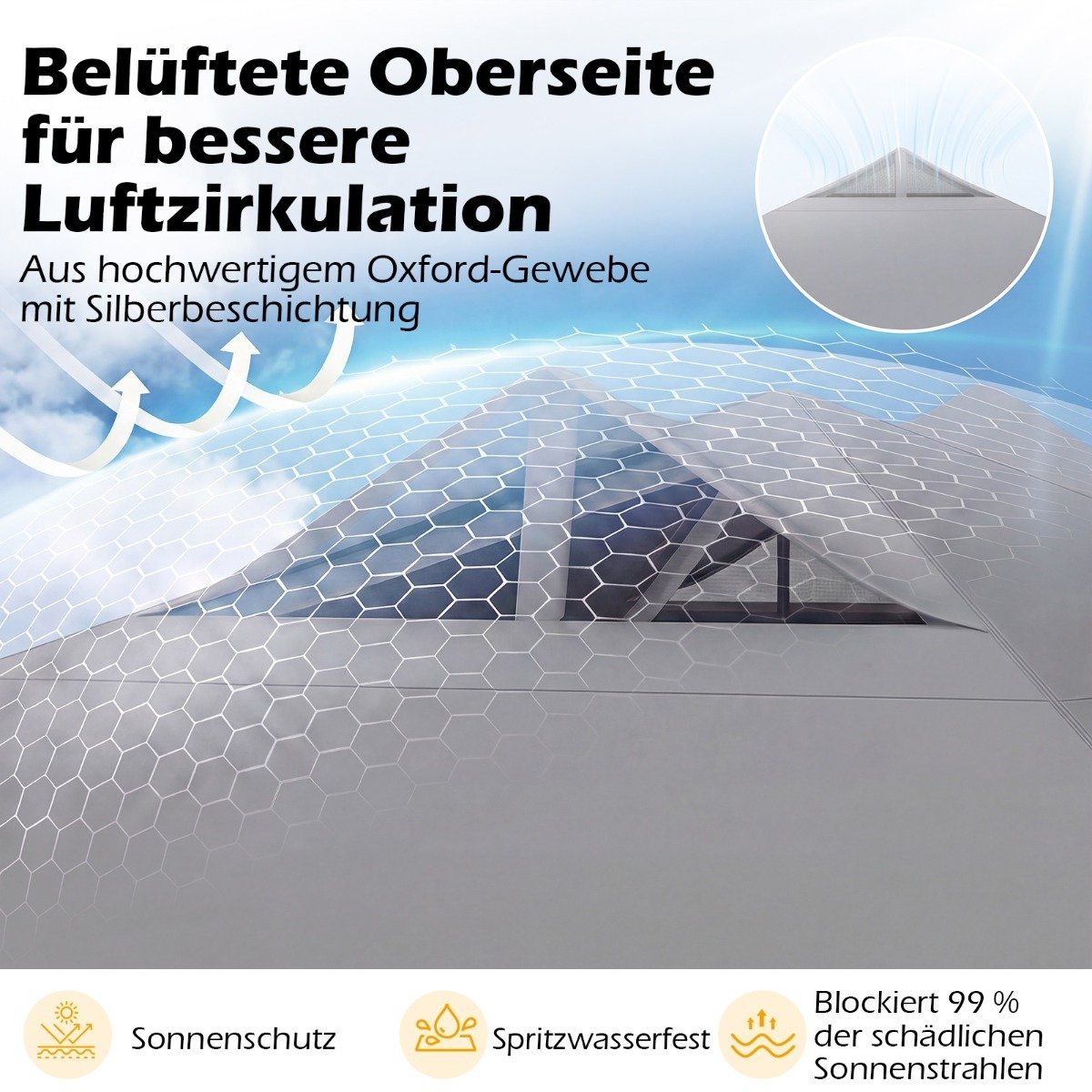 - Erdvus 9 m² pavėsio plotas, tinkamas 10-12 žmonių, su 3 greitai reguliuojamais aukščiais (250/260/270 cm).