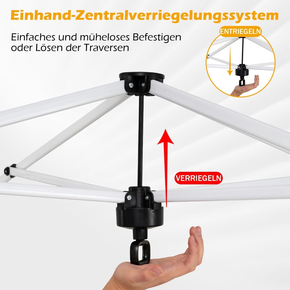 - Lengvas surinkimas vienam asmeniui dėl unikalios, viena ranka valdomos centrinės fiksavimo sistemos.