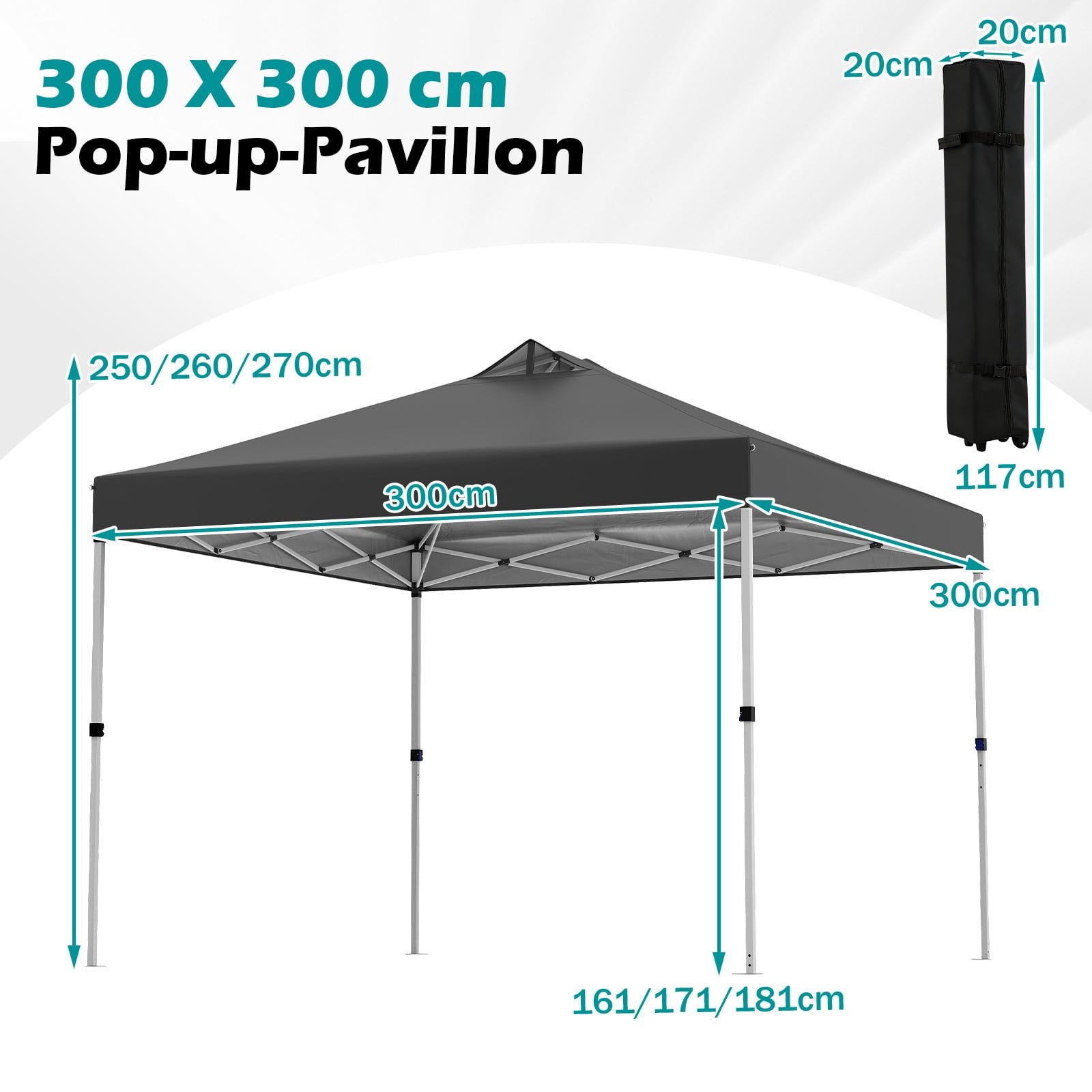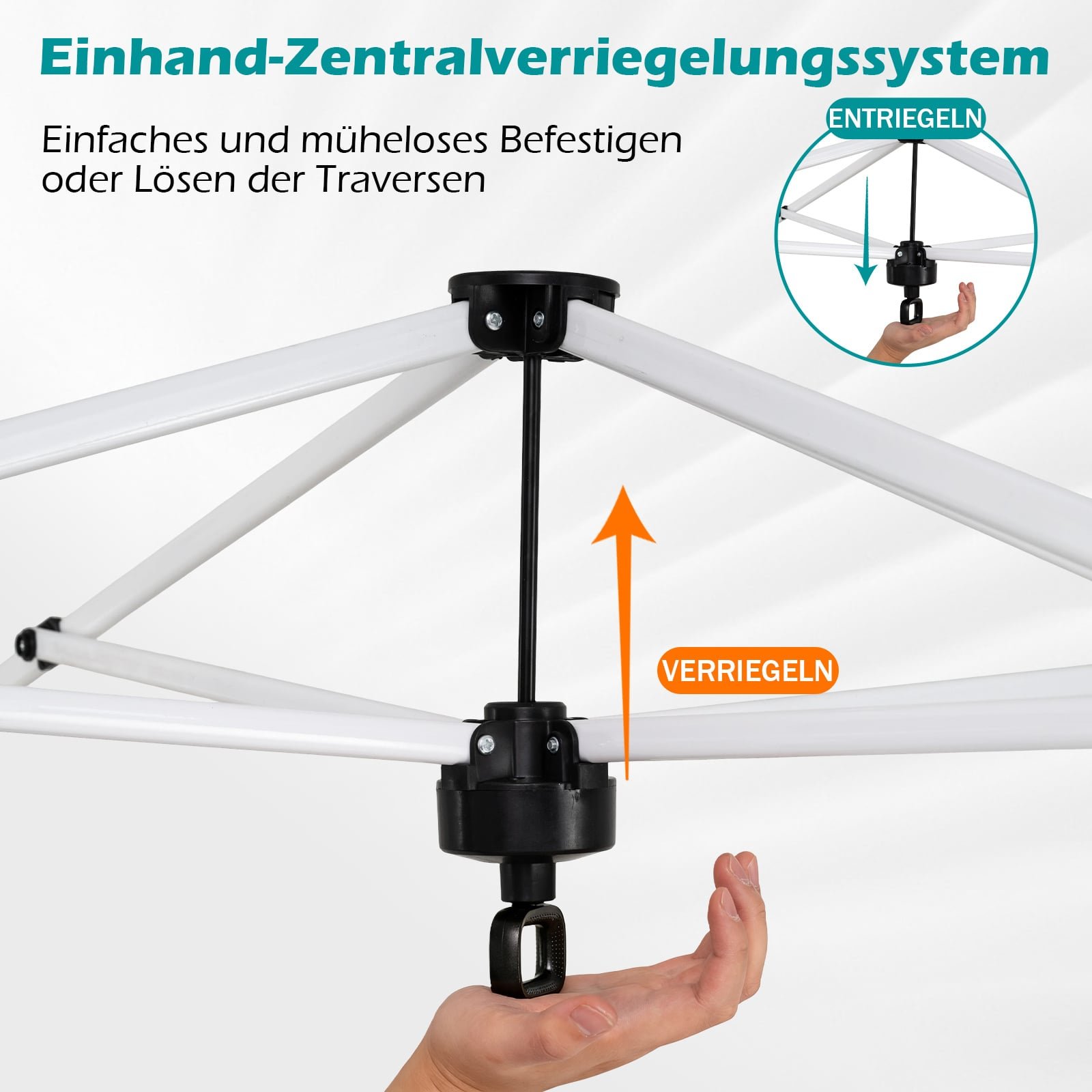 Mėgaukitės lauko renginiais be pastangų su novatorišku 3 x 3 m išskleidžiamu paviljonu, kuris akimirksniu suteikia pavėsį, yra lengvai transportuojamas ir patikimai veikia. Jo montavimas yra greitas ir be streso, net ir vienam asmeniui, dėl viena ranka valdomo centrinio užrakto mechanizmo. Aukščiausios kokybės oksfordo audinio stogas su sidabrine danga užtikrina puikią apsaugą nuo saulės, o ventiliuojama stogo konstrukcija pagerina oro cirkuliaciją, užtikrindama optimalų komfortą.
