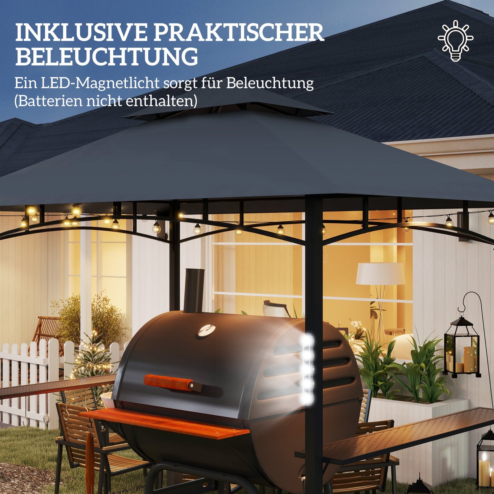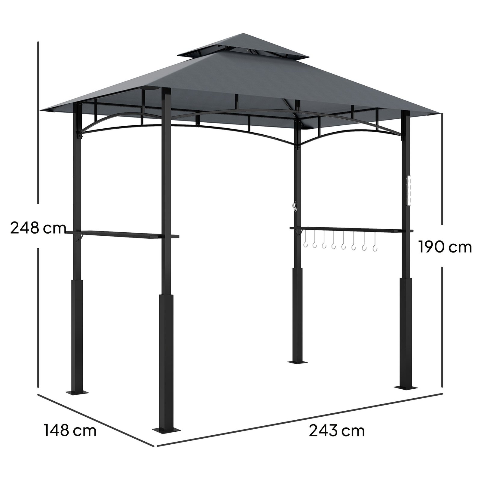 Dviejų aukštų grilio paviljono dizainas užtikrina puikią oro cirkuliaciją, o plastiku dengtas, ugniai atsparus stogelis suteikia daugiau saugumo. Integruotos sodo paviljono lentynos ir kabliukai užtikrina patogias laikymo galimybes, o LED magnetinės lemputės suteikia pakankamą apšvietimą vakariniam kepimui ant grotelių. Įsigykite mūsų stabilų grilio palapinę savo dideliam sodo vakarėliui!