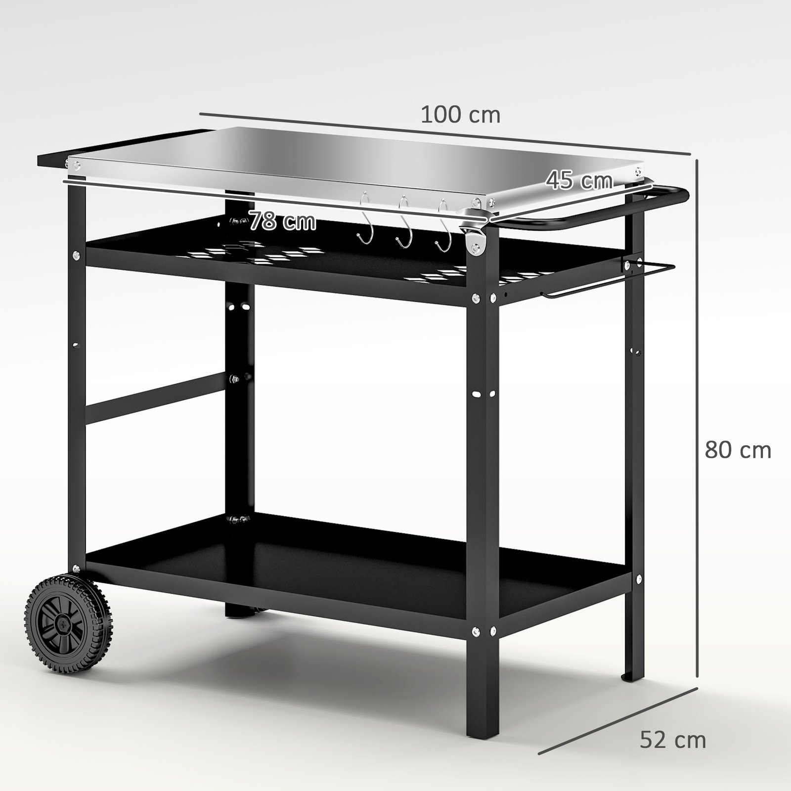 Kviečiate draugus? Padidinkite savo vaišingumą su šiuo universaliu grilio vežimėliu. Įrengtas su nerūdijančio plieno paviršiumi, lentynomis, prieskonių padėklu ir daugybe kabliukų, šis kepsninės serviravimo vežimėlis suteikia vietos maistui, gėrimams ir prieskoniams. Dėl didelių ratų mobilus serviravimo vežimėlis idealiai tinka ruošimui ir patiekimui piknikų, kepsninių ar šeimos susibūrimų metu.