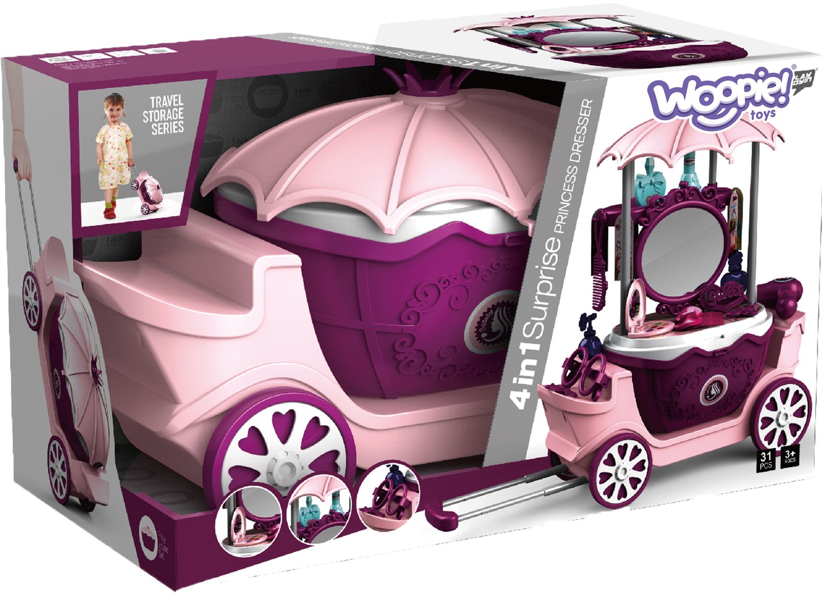 Žaislas pasižymi keturiomis skirtingomis funkcijomis: jis gali būti tualetinis staliukas, elegantiškas vežimėlis, praktiškas lagaminėlis su ratukais ir patogus krepšelis. Todėl vaikas gali žaisti tiek namuose, tiek lengvai pasiimti rinkinį į kelionę ar pas draugus. Didelis veidrodis su puošniu rėmu leidžia kurti šukuosenas ir makiažą. Įvairūs kirpyklos ir kosmetikos priedai paverčia žaidimą tikrovišku ir smagiu.
