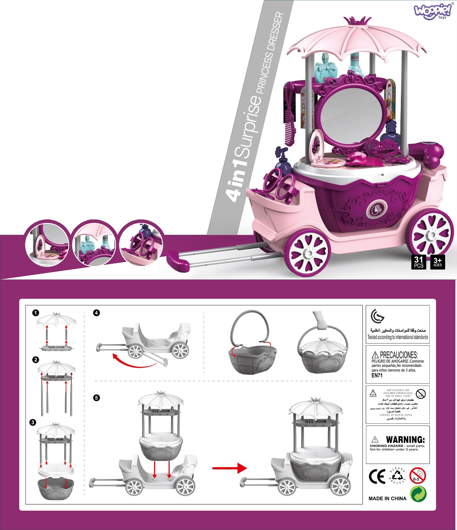 - 4in1 – keturios žaidimo funkcijos: tualetinis staliukas, vežimėlis, lagaminėlis ir krepšelis.