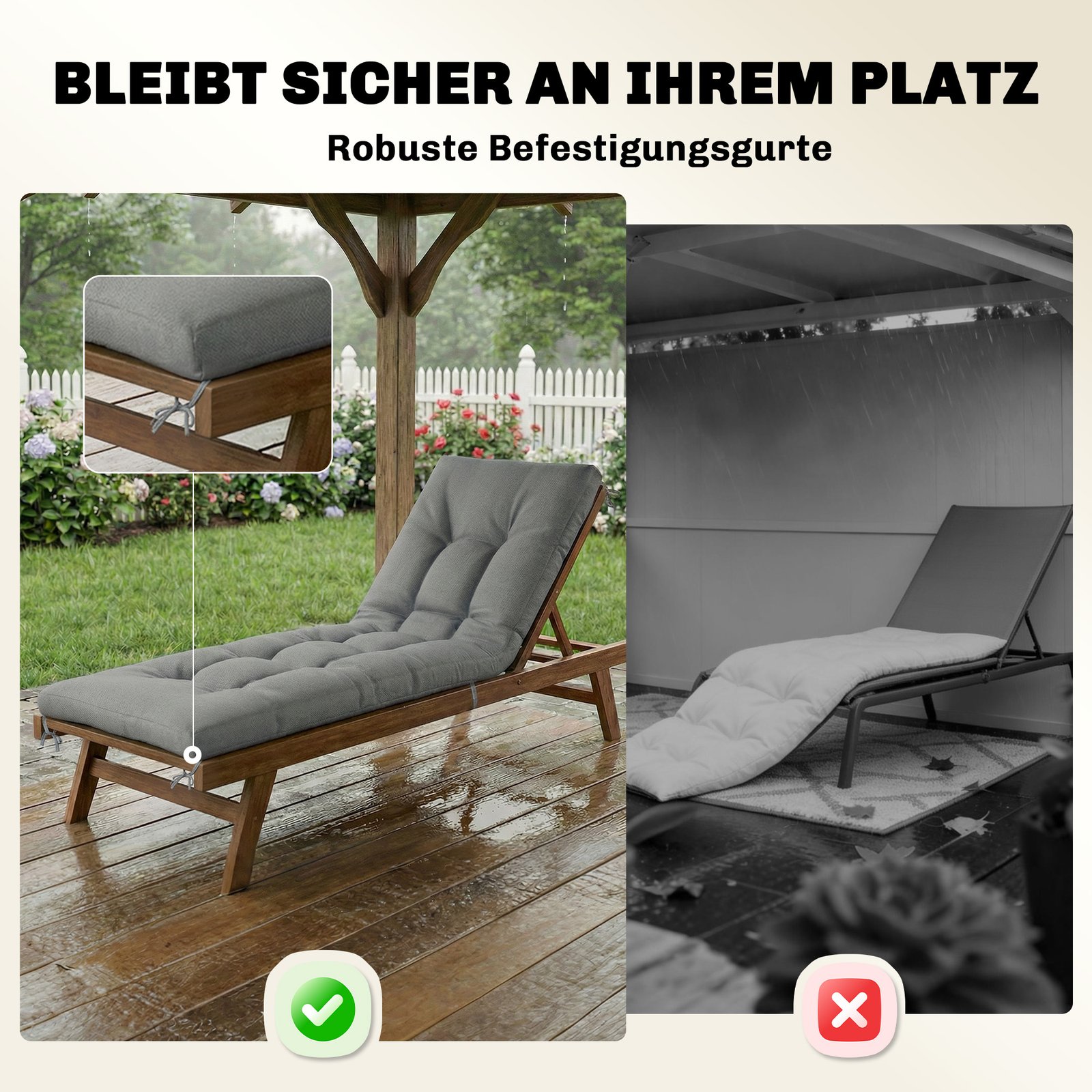 Gulimojo krėslo pagalvė su tvirtinimo diržais atspari oro sąlygoms