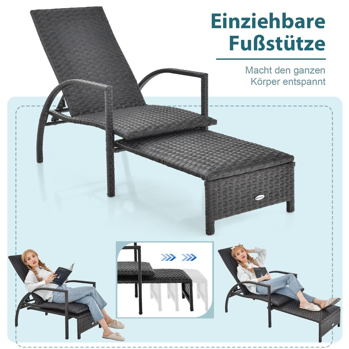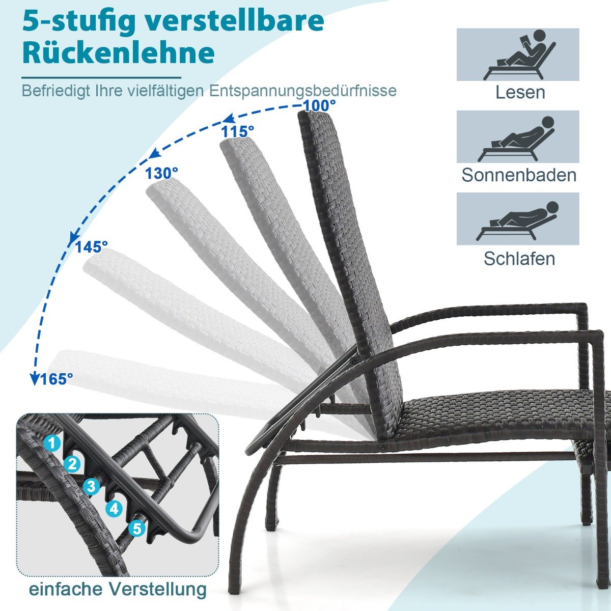 - 5 pakopų reguliuojamas atlošas užtikrina optimalią padėtį skaitant, deginantis ar tiesiog ilsintis.