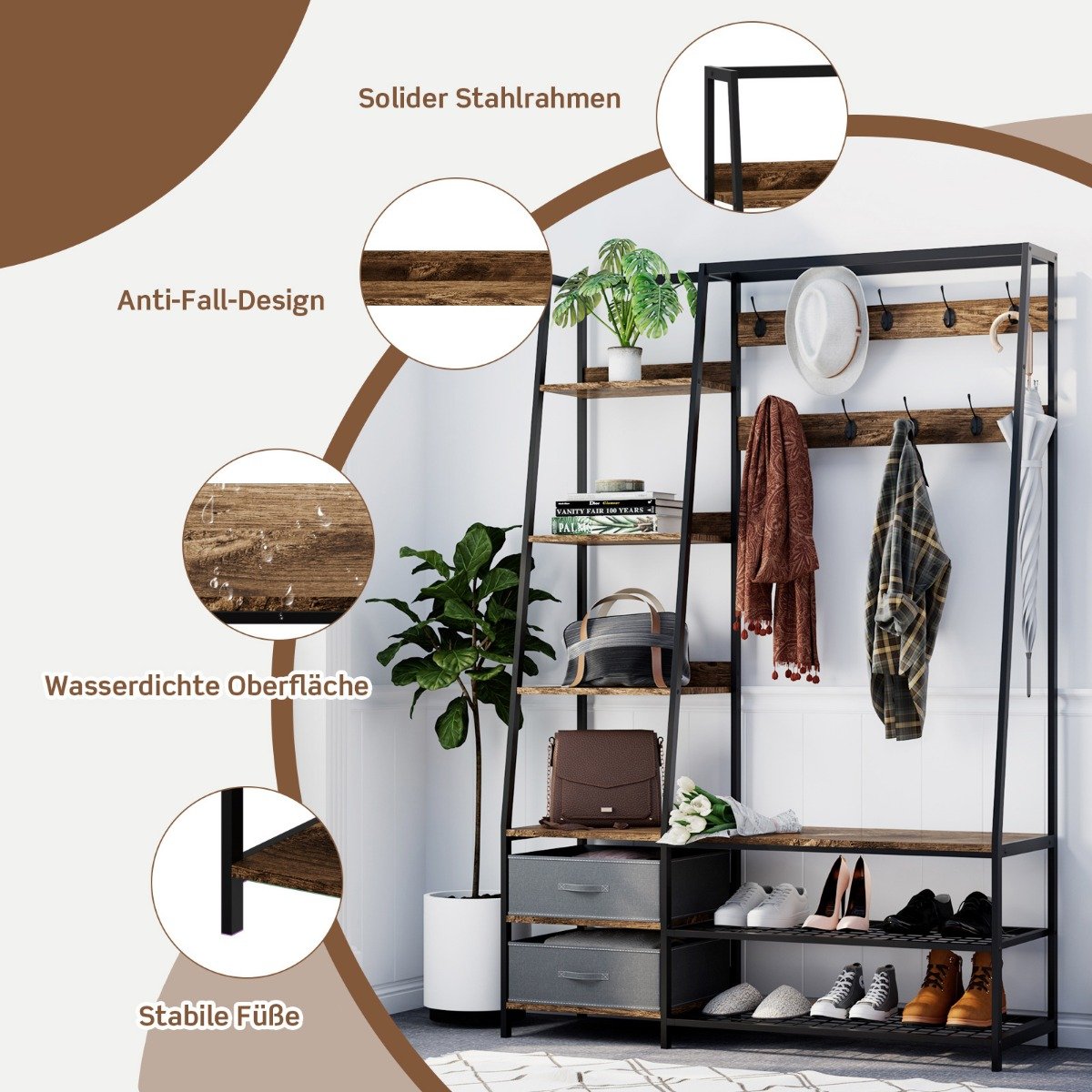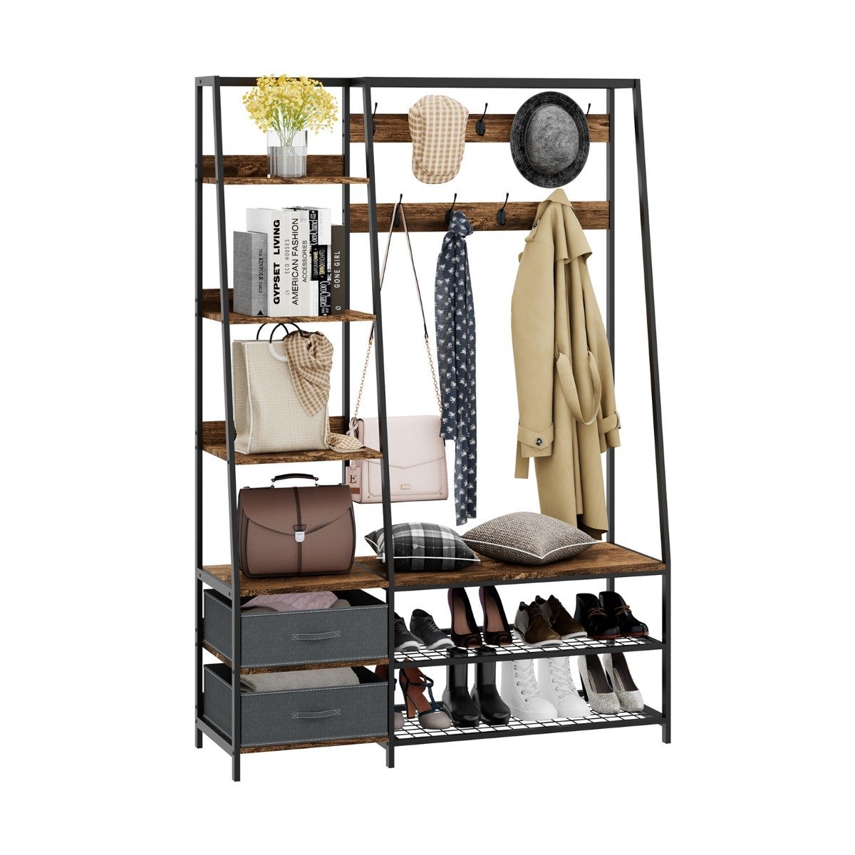 - Daug vietos daiktams: 9 dvigubi kabliukai, 6 lentynos, 2 stalčiai, suoliukas ir batų lentyna užtikrina pakankamai vietos visiems jūsų daiktams laikyti.
