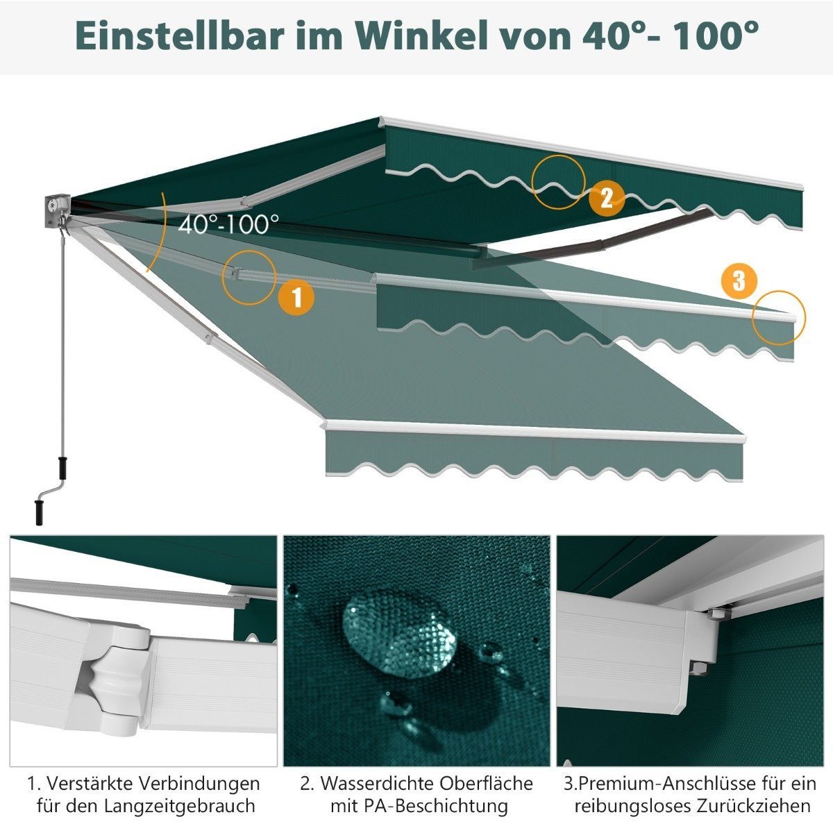 Ieškote sprendimo, kaip apsisaugoti nuo saulės ir lietaus? Ši ištraukiama markizė suteiks malonų ir pakankamai platų pavėsį jūsų balkone, terasoje ar kieme. Patogiai ir greitai valdoma su ilga rankenėle, ji leidžia reguliuoti markizės kampą nuo 40° iki 100°, taip prisitaikydama prie jūsų poreikių.