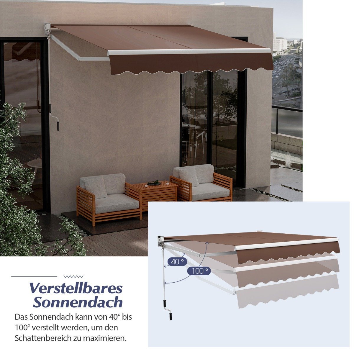 • Reguliuojamas markizės kampas (nuo 40° iki 100°) leidžia pritaikyti pavėsį pagal jūsų poreikius.
