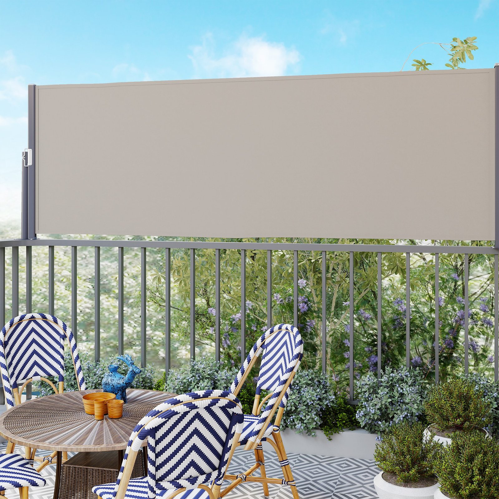 Su šiuo ištraukiamu šoniniu roletu greitai sukursite pavėsingą poilsio kampelį savo lauko erdvėje. Tvirtas metalinis rėmas užtikrina ilgalaikį stabilumą ir gali būti lengvai tvirtinamas prie cemento ar medžio masyvo. Lengvas ištraukimas ir fiksavimas praktiška rankena leidžia šią šoninę markizę naudoti ir kaip puikiai praktišką privatumo apsaugą patalpose. Elegantiška, nesenstanti išvaizda sumaniai užbaigia subalansuotą dizainą.
