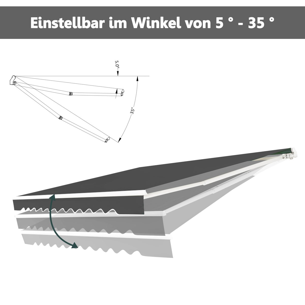 - Reguliuojamas markizės kampas (5–35 laipsniai) optimaliai apsaugai nuo saulės.