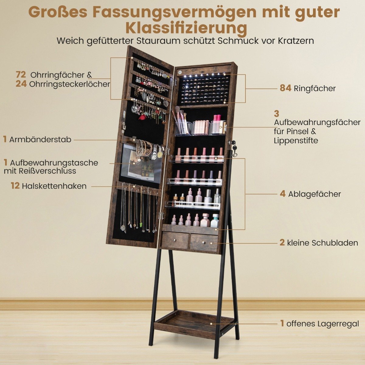Ši didelės talpos juvelyrinė spintelė – tai praktiškas ir organizuotas sprendimas visų jūsų vertingų papuošalų laikymui ir tvarkymui. Trys apšvietimo parinktys leidžia lengvai apšviesti visą jūsų papuošalų kolekciją arba rasti tinkamiausią detalę bet kokiai progai. Be to, ši spintelė yra 2-in-1 laikymo sprendimas, sujungiantis viso kūno veidrodį su juvelyrine spintelė.