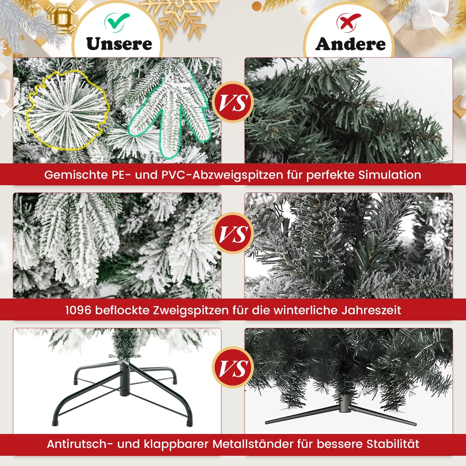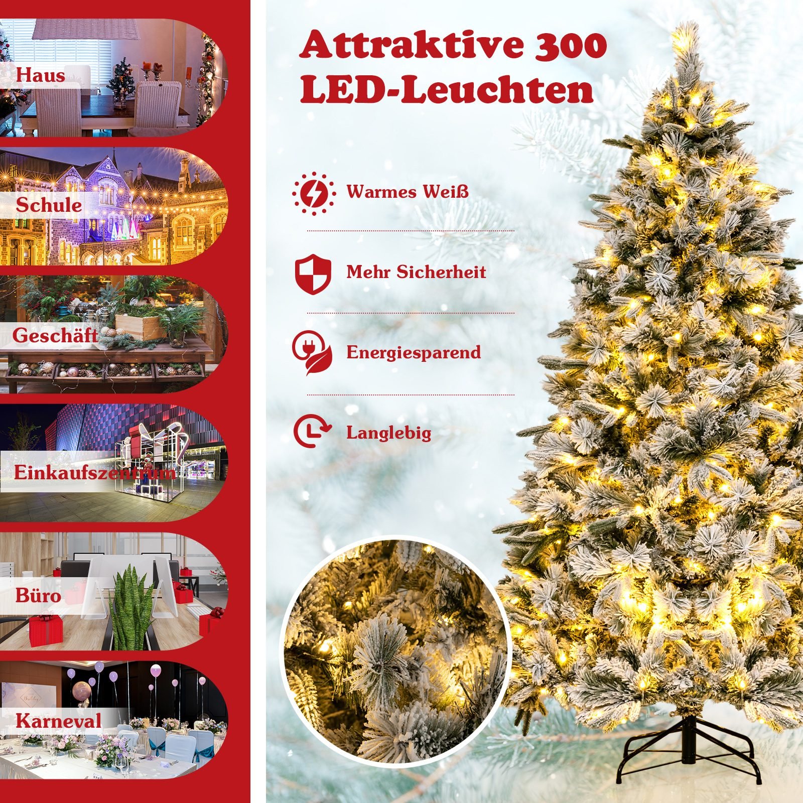 - 1096 šakų viršūnės, papuoštos dirbtiniu sniegu ir imituojančios pušies spyglius, suteikia itin natūralią išvaizdą.